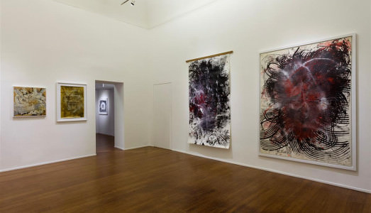 Dai Cinquanta agli ultimi anni di attività, le sale sono cariche (gli spazi non perdonano nemmeno la migliore delle intenzioni espositive) di opere esautorate da un andamento lineare; il sistema-mostra è basato sul loro rapporto creativo, in cui i primi passi Gutai (anni Cinquanta-Sessanta) sono messi in relazione con una fase intermedia (Settanta-Ottanta) e quella più contemporanea (Novanta-Duemila). Un diacronismo che vivacizza l’aplomb enigmistico dell’esposizione (tentare di associare l’opera all’anno di produzione è un’operazione divertente e non scontata), e soprattutto fa bene al senso critico soggettivo, che non deve mai mancare. Nemmeno di fronte ad un maestro e ai suoi alti e bassi. Se difatti lascia attoniti la pulizia delle piccole opere ad inchiostro su carta (tra le quali spicca un azzurro strepitoso), l’artista giapponese sembra aver perso identità nei quattro lavori multimaterici che mischiano reti metalliche a brandelli di tulle e strati di colore, datati tra il ’61 e il 2009.