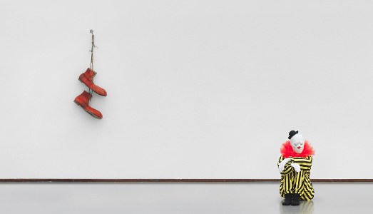 Questa tendenza alla monumentalità la ritroviamo in una delle due tappe della sua mostra romana, curata da Ludovico Pratesi, dal titolo giorni d’oro + notti d’argento. Lo spazio industriale dell’ex mattatoio del Museo Macro Testaccio è stato trasformato dall’artista in un luogo fantastico grazie al cromatismo acceso dei muri dipinti ognuno con un colore diverso in una sorta di psichedelico caleidoscopio in cui immergersi come in un trance. Vocabulary of Solitude è il titolo di questa abbagliante installazione composta da quarantacinque clowns, che, con le loro diverse posture rappresentano le varie, banali e vitali azioni che ogni essere umano compie quotidianamente. I clown hanno gli occhi chiusi e l’espressione enigmatica e, nonostante l’ambiente colorato e allegro in cui sono esposti, comunicano una profonda e fastidiosa tristezza. La solitudine dell’essere umano industrializzato e urbano è perfettamente raccontata dai nomi che ciascun pagliaccio ha: essere, respirare, dormire, sognare, svegliarsi, alzarsi, sedersi, ascoltare, guardare, pensare, stare in piedi, camminare, docciarsi, pisciare, cacare, mangiare, pulire, toccare, godere, amare, sperare, desiderare, cantare, maledire, sdraiarsi, mentire, cadere, ballare, vestirsi, bere…