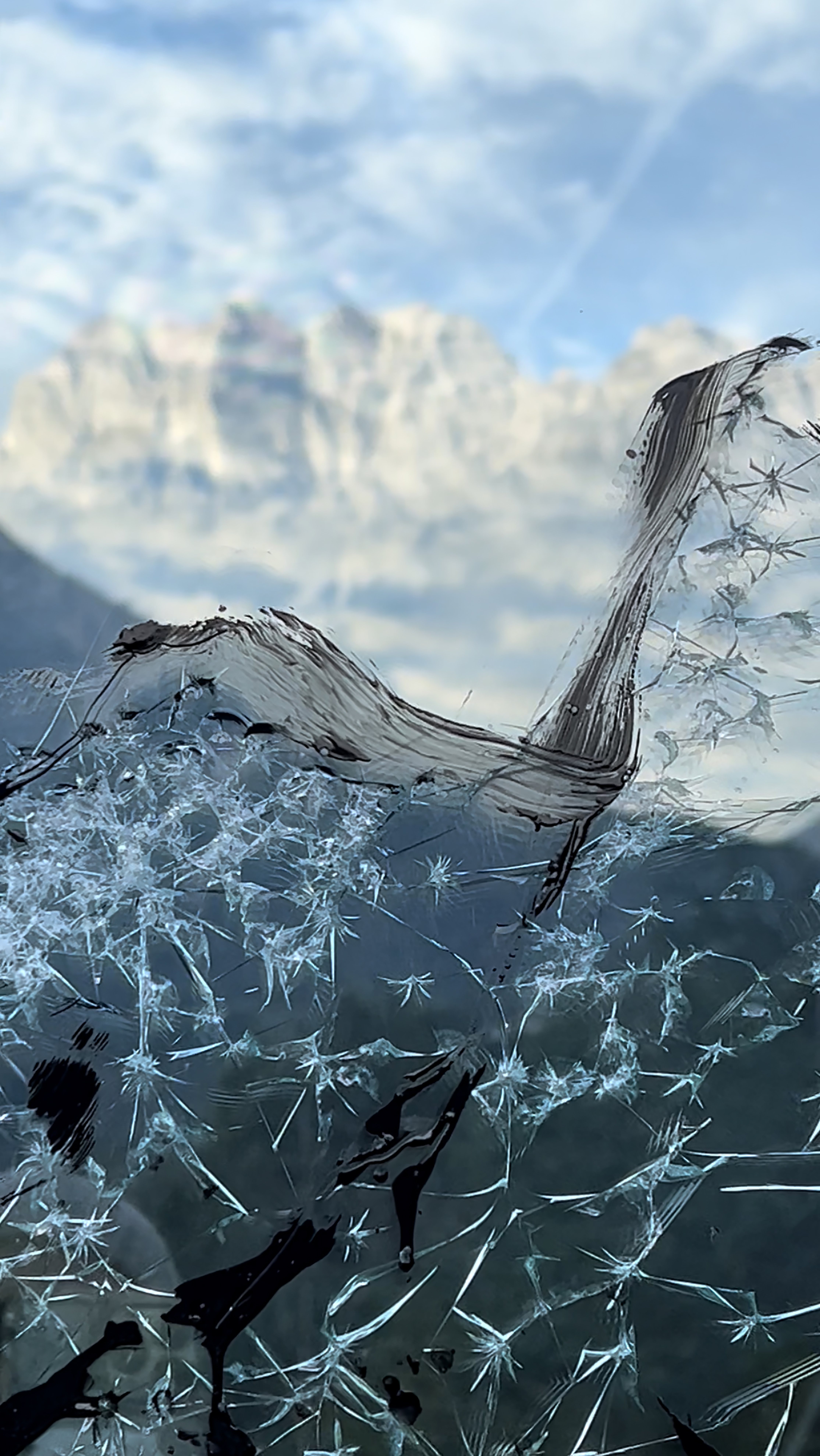 Dopo i pochi minuti necessari agli artisti per trattenere il fiato e calarsi nella parte, e consentiti al pubblico per guardarsi intorno incuriosito e porsi delle domande su quello che accadrà di lì a poco, la performance ha inizio esattamente nel momento dell’equinozio. Come in una partitura musicale per pianoforte, dove la mano destra disegna la parte melodica e la sinistra la accompagna nell’armonia, Claps inizia a tracciare con sottili linee nere il profilo delle montagne, mentre Berger, in un alternarsi contemplativo, con lievi ma udibili martellate, crea spaccature nel vetro che sprigionano luce propria. Pian piano le cime, dipinte e rese materiche ma allo stesso tempo eteree dalle rotture del vetro, si rivelano timidamente così come la loro copia originale, nascosta da nuvole passeggere.