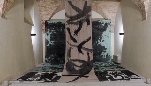 Il lavoro a inchiostro nero che Yahon Chang (sopra) in un allestimento site specific ha elaborato per l’occasione, sviluppa il concetto della stratificazione del pensiero e la sua esprimibilità. Installazioni di tessuti, carte, tele e sculture ci introducono nell’affascinante mondo dell’ideogramma. Riferimento che apparentemente ha la prerogativa di accoglierci e soddisfarci; in realtà, è solo l’imprinting sul quale fa filtrare la volontà ideologica, combattuta tra la sacralità della conservazione e la traducibilità del segno e la necessità di spogliarlo da tutto ciò, per accostarsi a un’esecuzione istintiva e rivelatrice. Sovrapponendo più strati di carta, adagiati su un enorme telo di cotone verde steso sul pavimento, nel tracciare il segno, dà priorità al gesto e all’inchiostro, con l’asciuttezza che lo caratterizza. L’immediatezza liberatoria dell’esecuzione è nello stesso tempo inizio e fine del racconto. Il momento d’intima felicità che duplica velocemente, si apre a una doppiezza di contenuto dalle aperture introspettive, come lo stesso autore in un suo scritto riporta: “Mescolato all’inchiostro e alla pennellata era la mia coscienza. Il mio cuore ballava con la mano mentre trovavo un delirio di gioia”. L’osmosi tra le carte, sovrapposte, e la tela di fondo che le contiene provoca, per assorbimento del colore, un’intelligibilità differenziata. Sovrapposizioni d’inchiostri si sommano dando origine a composizioni in cui il segno pittorico iniziale, sempre più rarefatto, trasmigra verso un’occidentalizzazione compositiva accostabile formalmente alle esperienze pittoriche degli artisti della metà del novecento. L’enorme drappo, sindone di gestualità espresse, diventa, nell’istallazione, parete e pavimento che accoglie un lungo doppio dazibao e un insieme di carte accostate. Aloni d’inchiostri accumulati come pensieri e azioni precedenti, ideogrammi come figure zoomorfe fatte d’energie e intenzioni. Tutte riempiono lo spazio delimitato. Duplicazione di segni, laboriosità di un’interiorità rivolta alla comprensione di tutti gli esseri viventi. Ponte tra la descrizione tutta orientale di una natura mistico-contemplativa e la volontà che Chang ha di svelarsi attraverso le interpretazioni occidentali del pensiero, le sue installazioni come “radiografie” ci forniscono il viatico per sondare il concetto dell’uno e il suo doppio nelle profondità consce e inconsce dell’animo umano. Essere non solo unica rappresentazione di se stessi ma proiezione simultanea di un esterno e un interno che contempli le varianti dell’animo umano e il loro processo evolutivo. Lavori dall’aura percepibile. Imperturbabili nella certezza del segno, si sdoppiano liberi, slegati da criteri ortodossi. Sondano l’essere senziente, il suo agire e la necessità di esprimere quell’indulgenza mistica che ne contempli l’imperfezione.