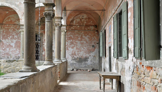 Nel cuore del tessuto storico bergamasco torna a rivivere un contenitore dismesso tra i più significativi della città: il monastero di Sant’Agata del Carmine, fondato nel lontano XV secolo. A svelare la magia dell’antico complesso è Contemporary Locus, associazione culturale che dal 2012 è attiva nella realizzazione di progetti espositivi in luoghi nascosti, dimenticati, di particolare interesse storico-artistico. Per l’ottava edizione, tre artisti internazionali Evgeny Antufiev (Kyzyl, 1986), Etienne Chambaud (Mulhhouse, 1980) e Berlinde De Bruyckere (Gent, 1964) e una scultura sociale, l’Atelier dell’Errore – “quattro artisti”, precisa la curatrice Paola Tognon – si relazionano intimamente alla segretezza del luogo con lavori site-specific e opere appositamente scelte. Lo splendore e lo stupore che a prima vista generano i fregi che si scavano tra le pareti, i moniti latini, i camini spenti e i dipinti parietali logorati dall’azione corrosiva del tempo, è subito ricondotto all’ordine da un distanziatore museale realizzato in pelle di pitone di Seba, Contre-Dépouille (Undrcuts), 2012. Attratto, e al tempo stesso distante, il pubblico resta immobile di fronte a quest’opera di Etienne Chambaud, indotto a riflettere sull’identità delle perturbanti presenze articolate efficacemente nei due ampi saloni. La scelta allestitiva non è casuale: il numero due è il simbolo della separazione dell’unità che è per essenza una e unica. Espressione della dualità, il numero due è incarnazione degli opposti che le opere in mostra esprimono: preda / cacciatore, umano / animale, umanità / animalità, appartenenza / differenza. L’ambivalenza di questo numero rende impossibile stabilirne una precisa funzione e il percorso espositivo svela la fragilità del confine fra umano e animale, coinvolti in uno scambio consapevole come quello tra storia e immaginazione che Evgeny Antufiev, servendosi di stoffa e filo, racchiude in una forma senza titolo, che sembra prodotta dal sonno – o forse dal sogno – della ragione (Untitled, 2013 – Courtesy Collezione Maramotti).