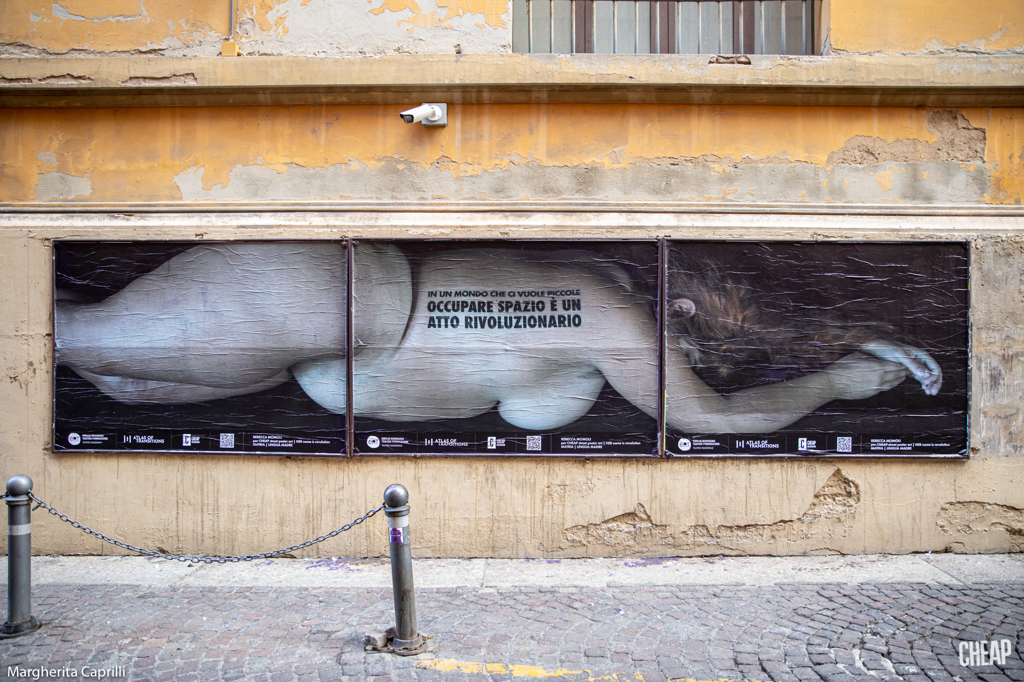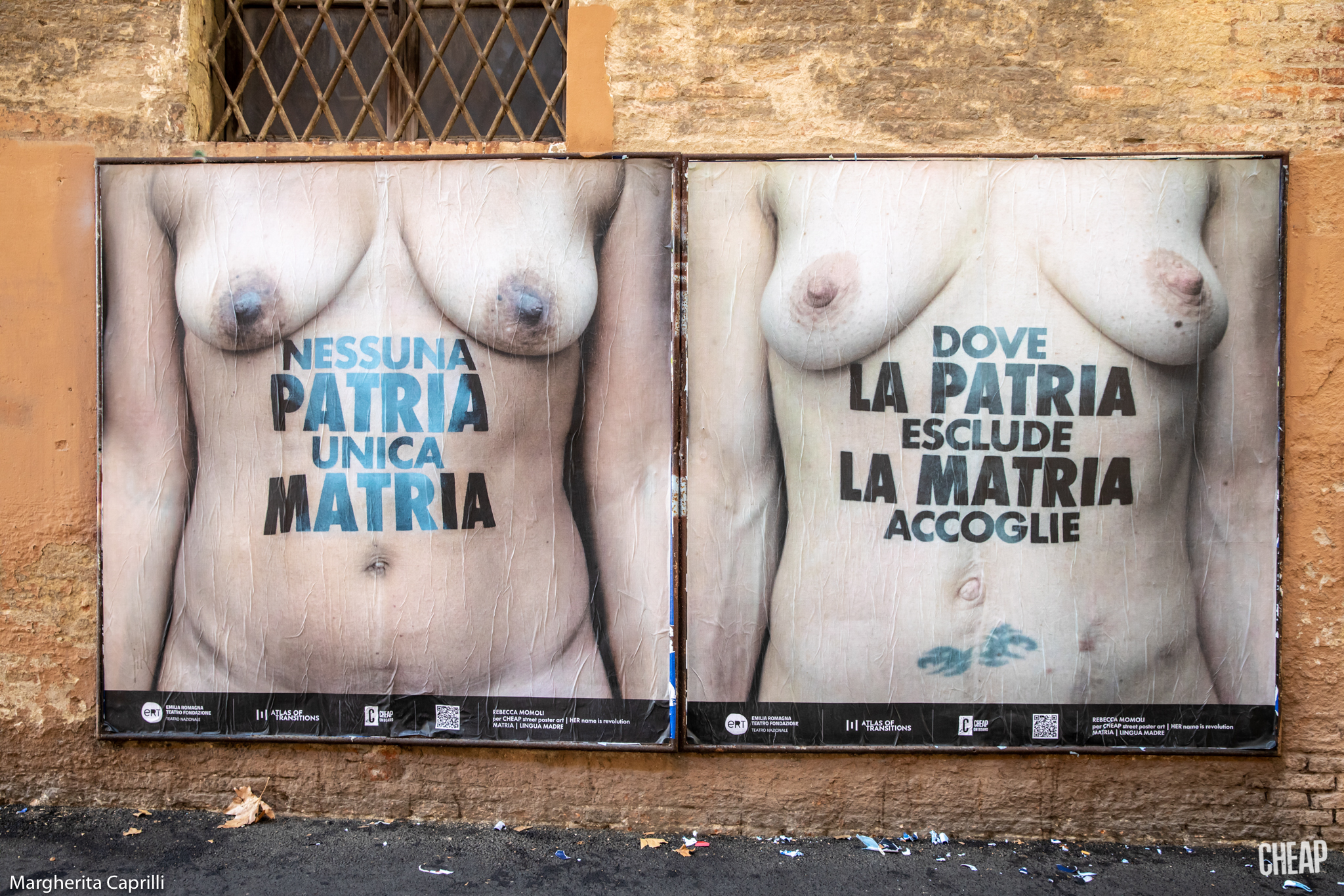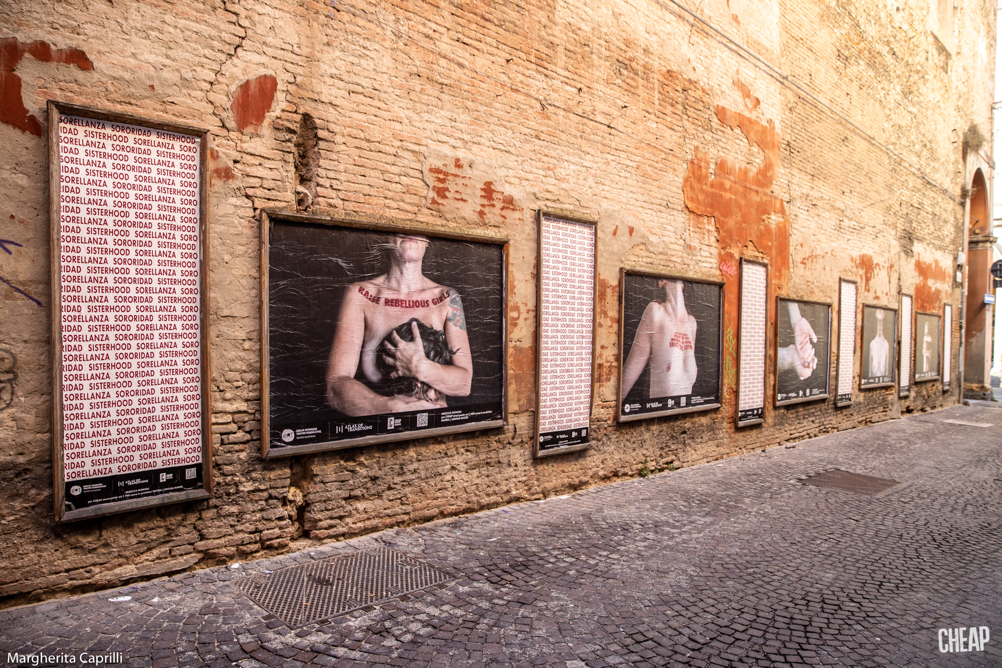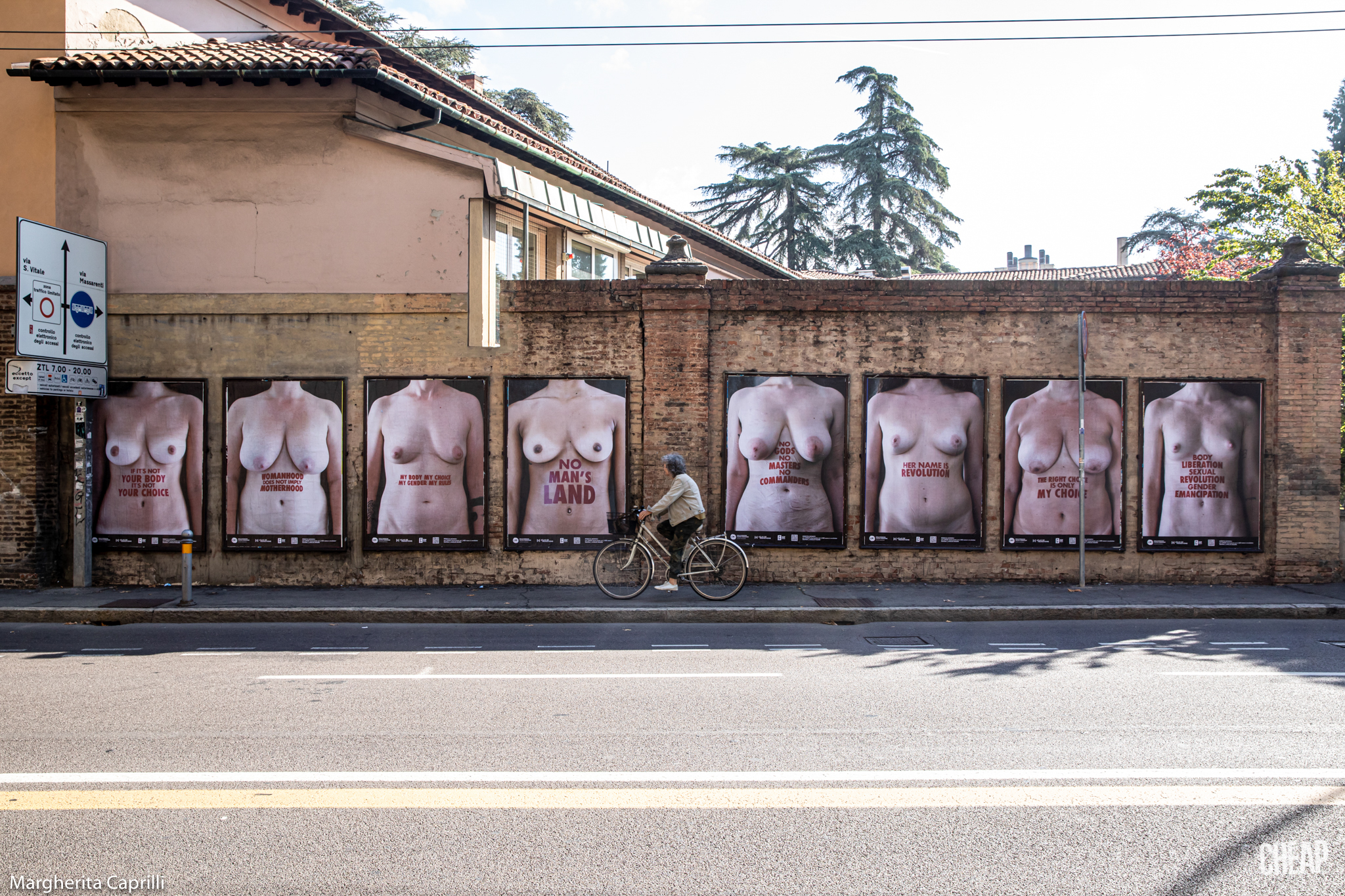 Ironia della sorte: la fruizione più tradizionale dell’iniziativa, passeggiando per Bologna, paradossalmente risulta più semplice di quella digitale, dove spesso e volentieri i social network censurano i poster di CHEAP, per la presenza di nudità femminili. D’altronde abbiamo ricordato che il nostro corpo è un campo di battaglia, e un capezzolo femminile è ancora la pietra dello scandalo per Facebook & co. Noi sfidiamo la sorte, e vi proponiamo una gallery degli scatti dell’installazione urbana diffusa, con le fotografie di Margherita Caprilli.