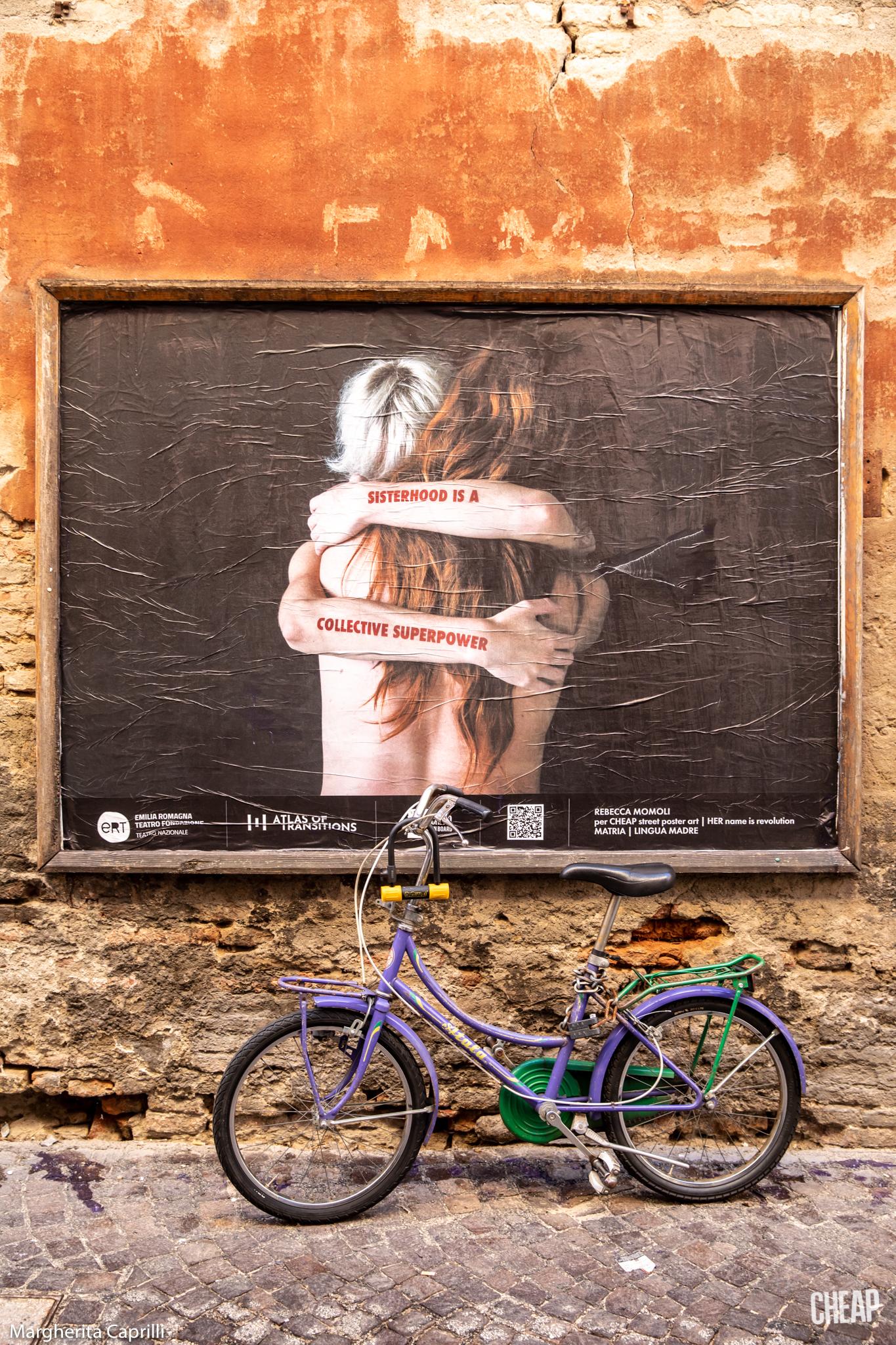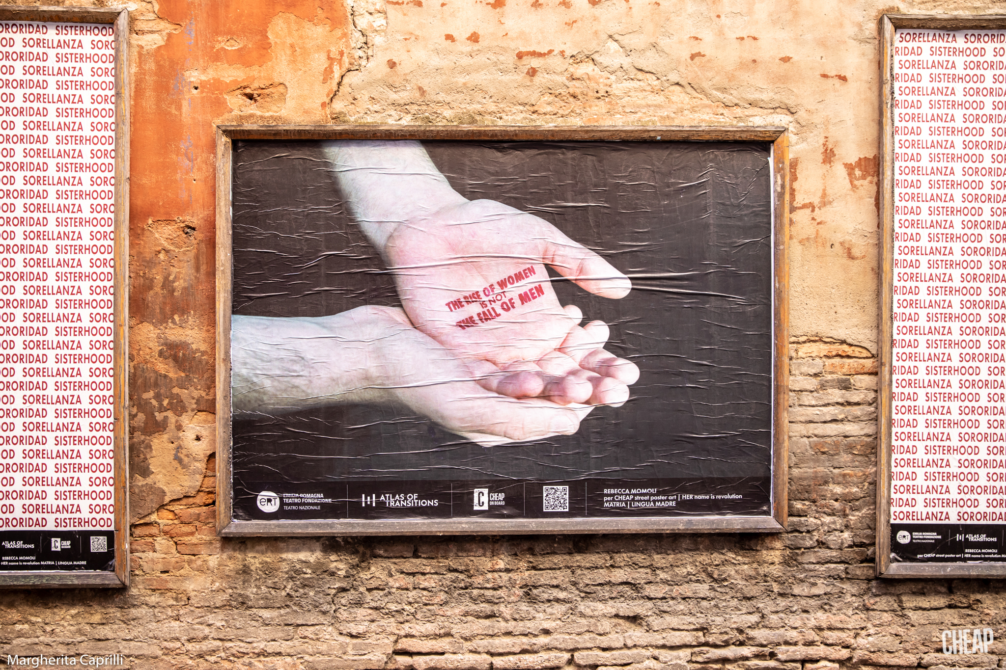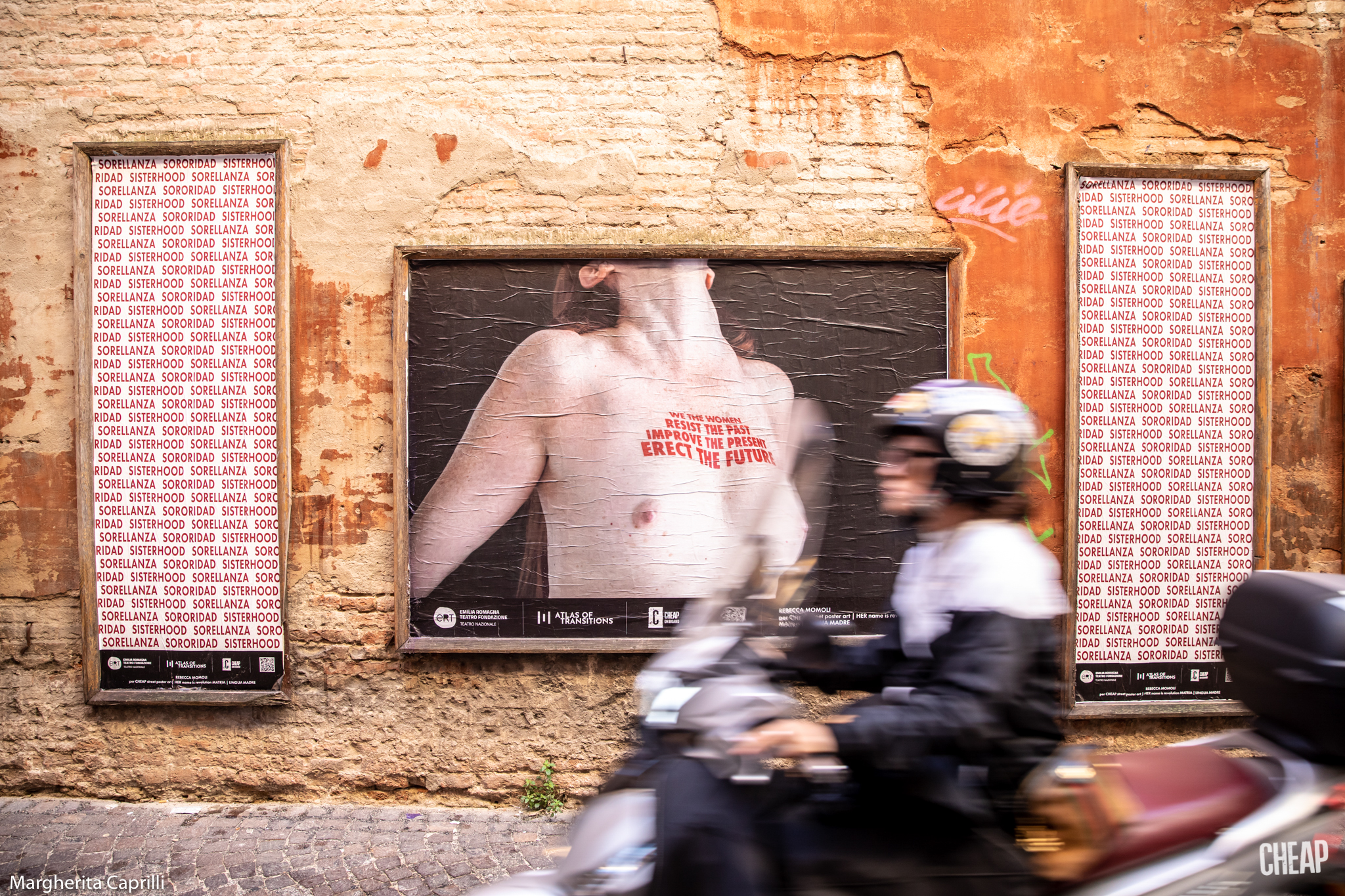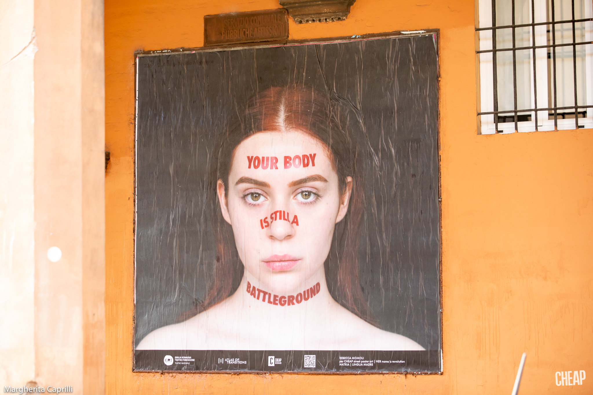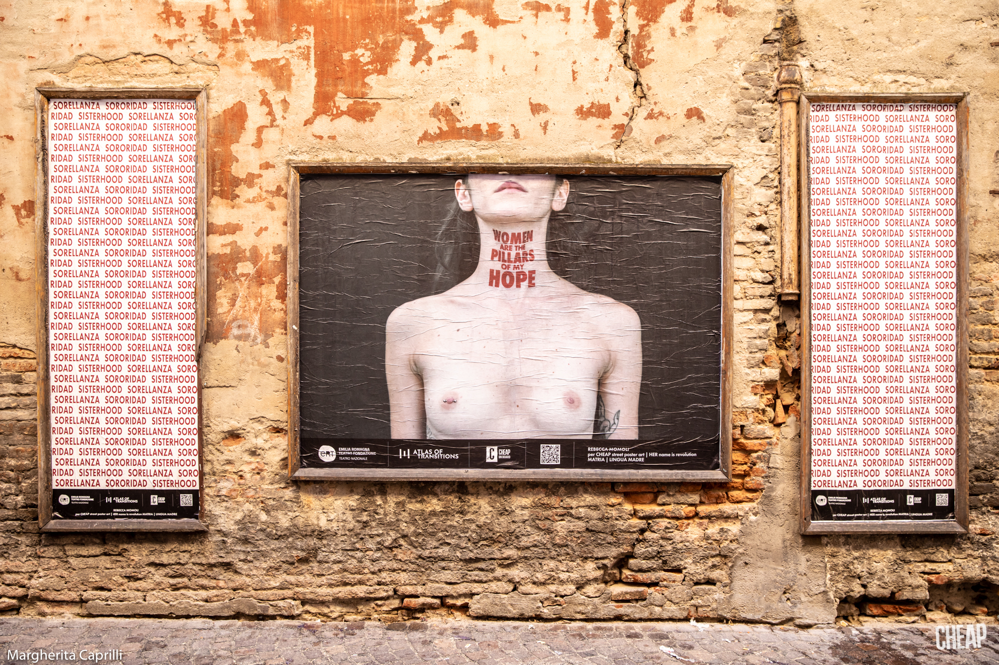Ironia della sorte: la fruizione più tradizionale dell’iniziativa, passeggiando per Bologna, paradossalmente risulta più semplice di quella digitale, dove spesso e volentieri i social network censurano i poster di CHEAP, per la presenza di nudità femminili. D’altronde abbiamo ricordato che il nostro corpo è un campo di battaglia, e un capezzolo femminile è ancora la pietra dello scandalo per Facebook & co. Noi sfidiamo la sorte, e vi proponiamo una gallery degli scatti dell’installazione urbana diffusa, con le fotografie di Margherita Caprilli.