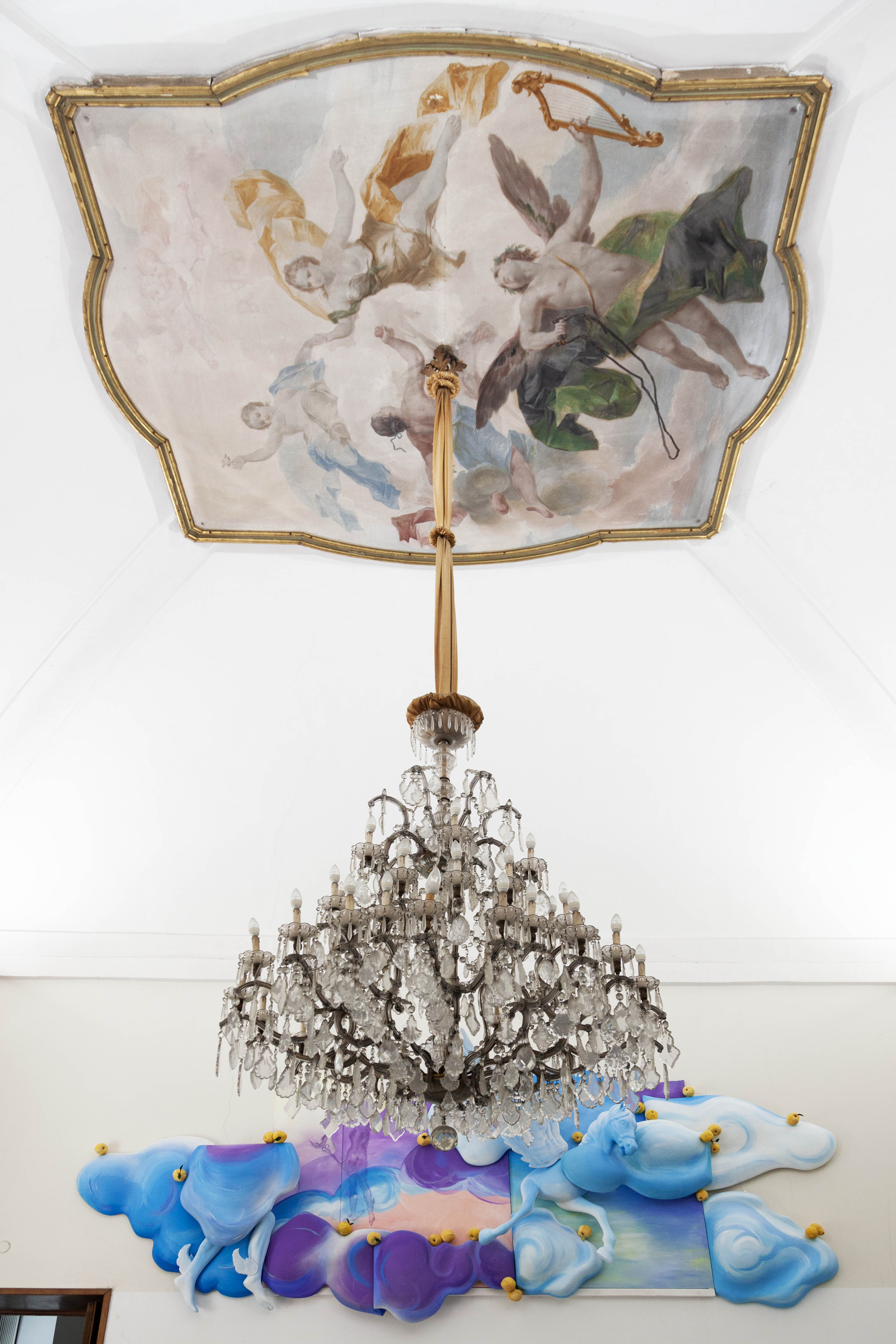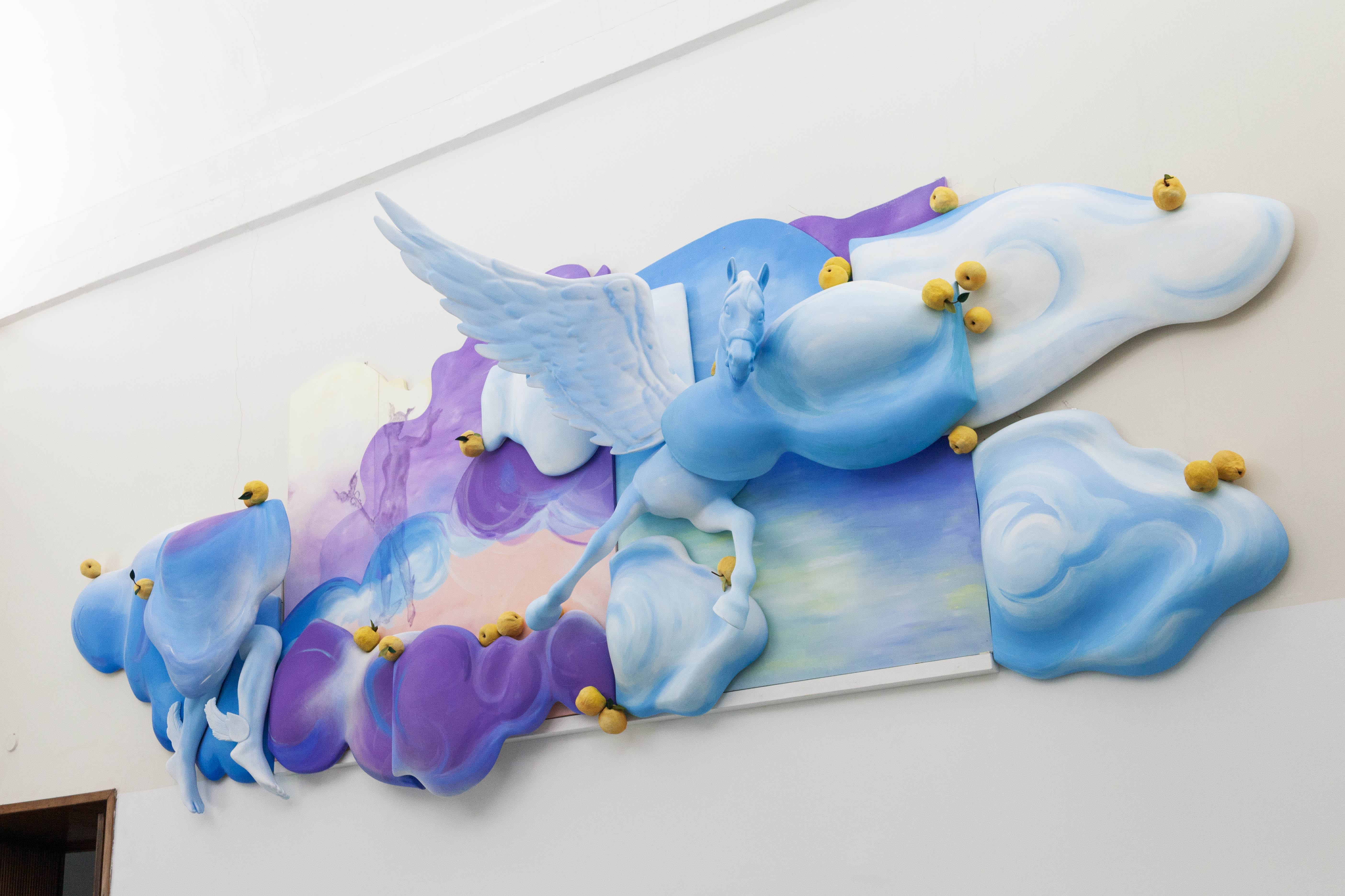 «Nella cupola dello spazio che ospita il mio lavoro alla Biblioteca Sormani in un grande affresco è raffigurato un personaggio mitologico che regge delle briglie dipinte in modo molto dinamico, come se avesse appena lasciato andare un cavallo. È un personaggio un po’ marginale rispetto alla narrazione centrale che però ha catturato la mia attenzione non appena abbiamo montato il lavoro. Mi sembrava che proprio da lì il cavallo protagonista della mia storia si fosse staccato per iniziare la sua corsa. Questo credo sia il dialogo che si è creato nello specifico nella stanza, una sorta di montaggio di due brevi sequenze cinematografiche…Poi continua fuori scappando dalle finestre della Sormani, dialoga con le nuvole e si arrotola nel cielo».