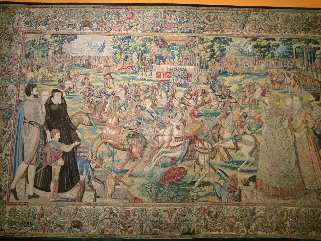 Gli Uffizi hanno prestato tre arazzi magnifici dal titolo in francese “Tenture des Fêtes des Valois”. Si tratta di un “testamento in tessuto” della reine-mère dove sono rappresentate tre feste diverse che hanno due scopi: mostrare la ricchezza della corte dei Valois ed essere l’occasione per incontri politici e diplomatici con ad esempio la corte spagnola. Nei dipinti di altre sale vengono descritte le feste organizzate in occasione dell’ingresso del re a Parigi o i battesimi, i carnevali al Louvre o a Fontainebleau. E’ esuberante la decorazione nelle vesti dei personaggi carnevaleschi, che ricorda proprio la follia d’oro e decori del castello. Nel secondo arazzo della “Tenture des Valois” la balena meccanica al centro della composizione era stata effettivamente immersa nel fiume di Bayonne, vicino al confine spagnolo, per una festa e battaglia notturna per festeggiare la celebre entrevue de Bayonne (giugno 1565). Elisabetta di Valois, figlia di Caterina e Enrico II, doveva essere accompagnata dal re di Spagna Filippo II per un incontro importante per la diplomazia francese. La festa fu magnifica, ma l’incontro fu un fiasco politico: il re spagnolo non si presentò, sostituito dal duca d’Alba, il cui cattolicesimo era ancora più duro in un momento così delicato come le guerre di religione.