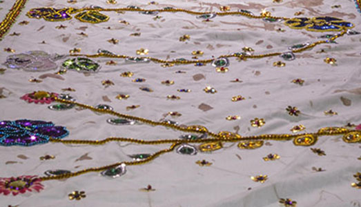 Una tela bianca lunga 25 metri posizionata su un piano retroilluminato, della stessa altezza di quelli utilizzati negli obitori, sulla quale un gruppo di sette donne dell’etnia Aymara ha ricamato una serie di decorazioni con paillettes e perline colorate, secondo i motivi tipici delle danze popolari boliviane, che lasciano intravedere, ad un occhio attento, le macchie di sangue ancora presenti sul tessuto: l’artista aveva addirittura suggerito di riprodurre alcune scene di violenza sessuale subite dalle donne uccise, ma le ricamatrici si sono rifiutate. Così questa tavola regale, impreziosita da ricami pregiati e delicati, sembra appartenere a cerimonie religiose festose e felici, mentre nasconde un’anima terribile che diventa ancora più insopportabile con questo efficace camouflage. Le due sale laterali, delle stesse dimensioni, sono dedicate alle storie di due prostitute transessuali di Ciudad Juarez: Karla, uccisa a 67 anni nel 2015, e La Gata, assassinata a 32 anni nel 2016. In fondo alla sala sono installati i loro ritratti fotografici a grandezza naturale, in bianco e nero e su light box, mentre dalle pareti alcuni speakers diffondono con un tono basso, quasi sussurrato, le loro voci e le voci di chi le ha conosciute da vicino in italiano e spagnolo: una sorta di sottile litania funebre, che rende il racconto ancora più sobrio ed essenziale, ma diretto nella sua drammatica evidenza. Karla e La Gata sono state barbaramente uccise ma non rivendicate da nessuno, perché vivevano ai margini della società e quindi erano personaggi scomodi, corpi dei quali poter abusare liberamente senza troppi sensi di colpa. E oggi, dopo i fatti di Rimini, il coraggioso e profondo lavoro di Teresa Margolles si dimostra tragicamente attuale anche in Italia, dove essere donna diventa ancora, giorno dopo giorno, più problematico.