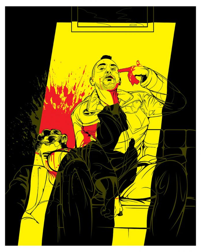 Altro bell’esempio è “TAXI DRIVER” di Martin Scorsese (da ieri splendido 80enne e dal 19 novembre saranno 60 per Jodie Foster appena 14enne in questo film). Qui l’artista Sam Ho lavora su altri livelli di racconto…i colori, le ombre, le linee, i tagli di luce condensano e sprigionano in una immagine le atmosfere del film selezionate dalla personalità dell’artista.