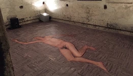 Toni ancora forti con On My Skin, l’installazione di Francesco Arena sul tema della prigionia, che per l’artista è un processo che porta alla spersonalizzazione, accompagnato dalla perdita di dignità dell’uomo, e che racconta con una grande foto dell’attore Franco Leo, nudo, mostrato sul pavimento della cella, che il pubblico può calpestare, diventando protagonista di una nuova involontaria violenza. Un lento processo di deterioramento scandito dalla musica del compositore americano William Basinski, versione inedita rispetto all’originale intitolata Disintegration Loop per poi scomparire letteralmente insieme all’immagine.