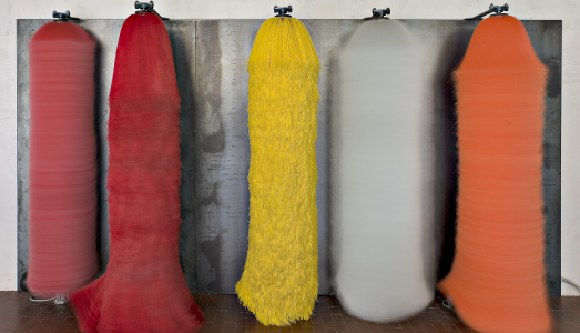 Differente temperatura per gli artifici di “Industriale Immaginario”, a cura di Marina Dacci, dove la scena si gioca con quegli elementi che hanno ispirato tanta arte dell’ultimo secolo, in quel rapporto tra uomo e macchina che diviene costruzione per altre forme, macchine celibi, teatralizzazioni di ambienti e oggetti dall’identità decisamente mutante. Sono opere della Collezione che non hanno preso posto tra gli spazi del secondo e terzo piano, sede della raccolta permanente di Maramotti, ma che ora si rivelano – anche nella loro complessità – in una archiviazione di inclinazioni politiche, oltre che poetiche, che si riservano ad opere che prendono forma dal riuso di elementi alieni all’arte. Ci sono le spazzole automatiche dei lavaggi auto usate in Gummo III, 2008, da Lara Favaretto, che al muro si trasformano in un concetto: velocità, movimento, colore-pittura in forma futurista e il consumarsi di questi immensi pennelli contro una tela metallica; c’è Paolo Grassino con la sua Analgesia (2003-2004) di gomma nera, dove un gruppo di cani resta a fare la guardia ad una montagna di carcasse di autovetture, in una scena da cimitero americano, distopica, così come ha qualcosa di Blade Runner anche Car mirror eat raspeberries (2013) della vincitrice della quinta edizione del Max Mara Prize (e del Turner Prize) Laure Prouvost.