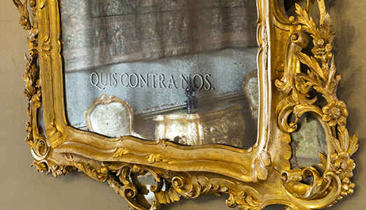Lo stemma di famiglia segna l’ingresso da terra: come d’abitudine, anche i Rezzonico usano il motto del potere Si Deus Pro Nobis, ma a questa frase manca un pezzo non da poco. Nella Lettera ai Romani, San Paolo diceva: Si deus pro nobis, quis contra nos? Espungerla significava nascondere la domanda cruciale su chi la pensa diversamente. E sappiamo quanto queste parole dimezzate di Dio abbiano pesato. Migliora “scrive” su due specchi del palazzo Quis contra nos. Non c’è punto di domanda, ma la constatazione che chi è contro si riflette su chi guarda.