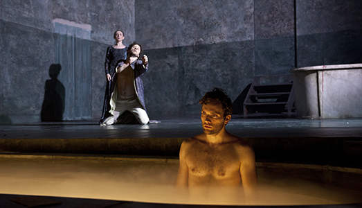 Prima stazione della trilogia Il pianto delle Muse, Conversation pieces ha avuto un primo indimenticabile allestimento open air nel 2013, e ora riscritto per una nuova versione al chiuso e con tre nuovi esemplari interpreti (al Teatro Poliziano per il 43° Cantiere Internazionale d’arte di Montepulciano). Del poema Manfred e della tragedia in versi Cain di George Gordon Byron, Filiberti ha tessuto una riscrittura originale drammatizzata in un unico arco narrativo; ha chiamato a raccolta altri poeti – Leopardi, Rilke, Schiller, Goethe, Rousseau, Keats, Baudelaire e molti altri, nella scena in cui piovono dall’alto, sulla platea, pagine vergate di versi che li ricordano –, e musicisti – Debussy, Mahler, Stravinskij, Wagner, Verdi e Dario Marianelli tra i contemporanei –. E ancora, nella sua ispirata e visionaria messinscena, ha evocato un atlante pittorico e scultoreo che richiama, fra il resto, La morte di Marat nella tinozza, lo Spinario in quel gesto plastico del togliersi la spina dal piede, il Fauno, nella classica postura da pittura egizia, e la Pietà, abbraccio infinito riconoscibile in tutta l’arte. Di Stravinskij, Le sacre du printemps, è la musica iniziale che accompagna la danza dei due fratelli, Caino e Abele, usciti lentamente da una vasca e avvinghiati in innocente simbiosi sulle note di un valzer. Quel risveglio primordiale, una nascita che il suono d’acqua rimanda al liquido amniotico, sarà subito segnato dal conflitto e dalla divisione. L’apollineo e il dionisiaco si manifesteranno nelle due entità.