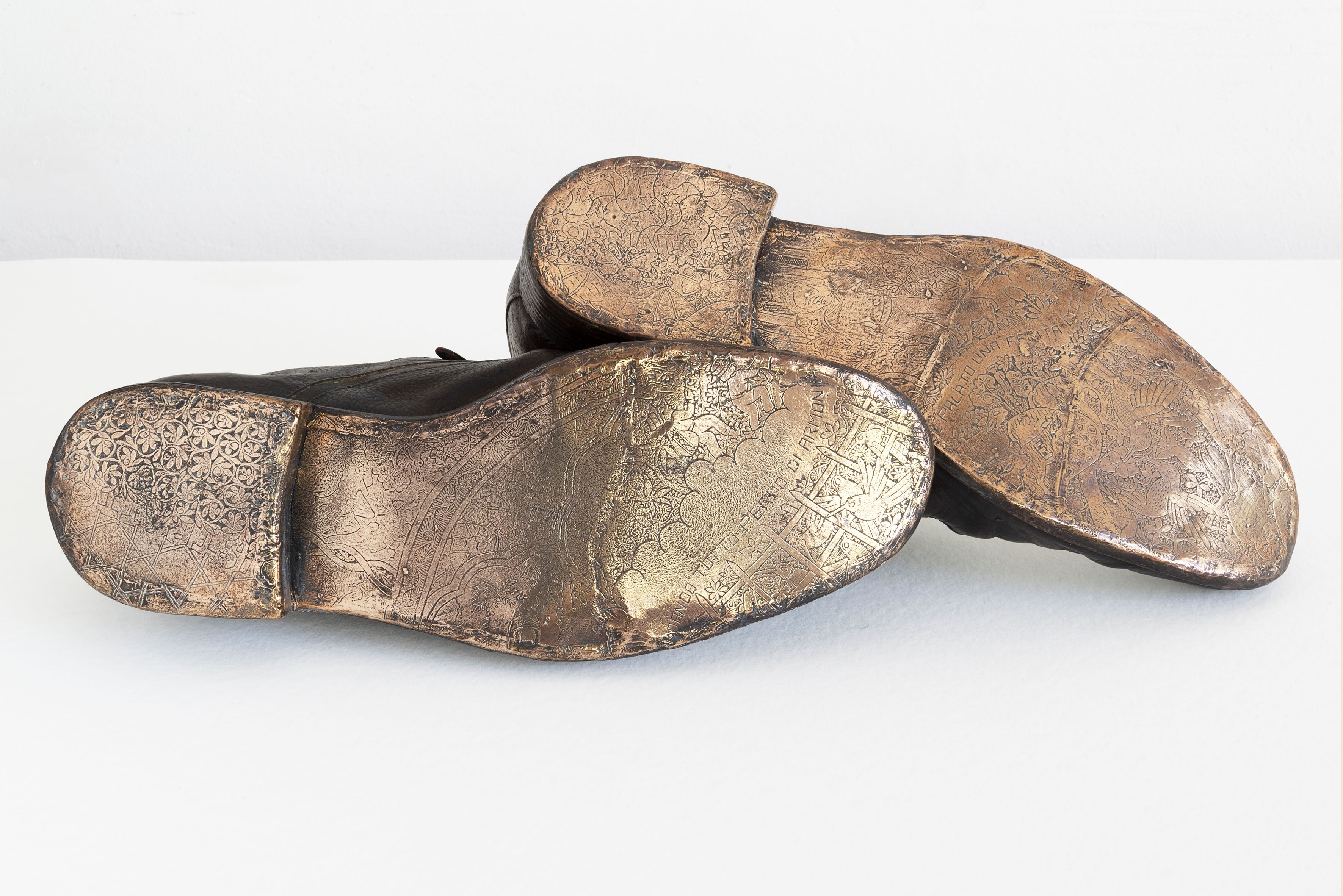 L’hotel The Rome EDITION, con i suoi soffitti scenografici alti sette metri, ospita le opere di Mirabella in un allestimento che trasforma lo spazio The Lobby in un luogo di narrazioni che si intersecano. Qui, mosaici inediti, realizzati su basi in travertino, dialogano con sculture evocative. Tra le opere, spiccano due colonne intitolate It is not true that e Il castone e la barota, decorate con tessere musive dai toni cobalto e calde sfumature terrose. A queste si affiancano due paia di scarpe scultoree: uno in bronzo con suole specchianti, l’altro in porcellana bianca con lustro. Questi oggetti, ispirati a calchi delle calzature personali dell’artista, simbolizzano il cammino del viaggiatore, sospeso tra memoria tangibile e immateriale.