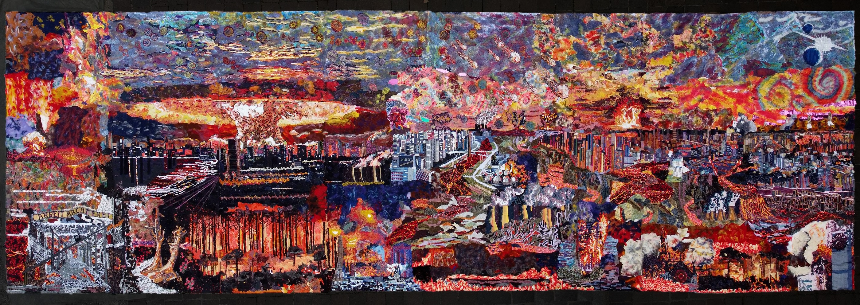 È invece una Blu Forest, una dimensione onirica in cui ripararsi e trovare consolazione, l’installazione di Michela Cavagna (Biella, 1971), un progetto interamente sostenuto da Piacenza Cashmere, realizzato con materiale di scarto da lavorazione industriale tessile. Inferno3000 è invece il grande pannello dei DAMSS (12 metri di lunghezza per 4 di altezza), un lavoro colossale realizzato in oltre 4.500 ore di lavoro, con più di 200 mq di tessuto. I due artisti (Daniela Arnoldi, ingegnere ambientale e Marco Sarzi-Sartori, architetto), mettono l’osservatore di fronte all’unico inferno di cui abbiamo traccia visibile e concreta, proprio qui, sulla terra.