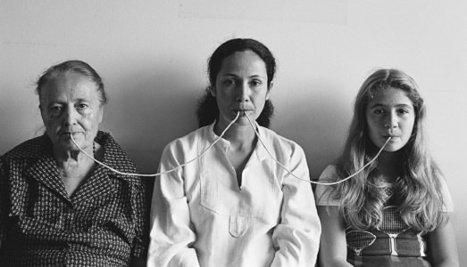 Anna Maria Maiolino, Por um Fio [Per un filo], dalla serie Fotopoemaçã [Foto-poesia-azione], 1976, Fotografia in bianco e nero, 52 × 79 cm. Collezione Finzi, Bologna. Courtesy Galleria Raffaella Cortese, Milano