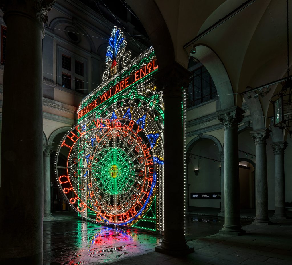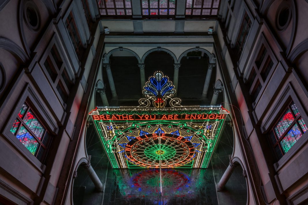 We rise by lifting Others parte dalla grande istallazione disegnata dall’artista per il cortile dello storico palazzo fiorentino, ispirata alle luminarie tipiche della tradizione dell’Italia meridionale. La luminaria posta al centro del cortile «crea una piazza tanto fisica quanto ideale – ha spiegato il Galansino – per cercare un senso di vicinanza, comunità in un momento di distanziamento sociale e fisico». Difatti, essendo il cortile aperto ai visitatori, al contrario del museo, chiuso per le norme anti Covid, questa installazione è fruibile a tutti coloro che hanno la fortuna di passeggiare per le vie di Firenze. Galansino si è anche detto molto onorato di ospitare a palazzo Strozzi questa installazione, esposta per la pima volta in un museo italiano.