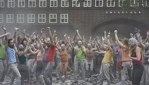 Amburgo 5 luglio 2017: un migliaio di uomini e donne rivestiti di una patina grigiastra, spuntando da ogni angolo del centro iniziano a camminare come morti viventi, sotto gli occhi dei passanti che scattano foto con i telefonini. All’improvviso uno degli zombi si sveglia dal suo letargo e, accorgendosi della grigità sua e dei compagni di strada ancora in trance, inizia a sfregarsi la pelle del viso, gli abiti, a togliersi la giacca, scoprendo pian piano il colore naturale della vita, spingendo i suoi vicini a fare altrettanto, fino a quando in pochi minuti i morti viventi tornano a sorridere, a ballare, ad abbracciarsi, urlare di gioia, svestirsi, correre per la città.
