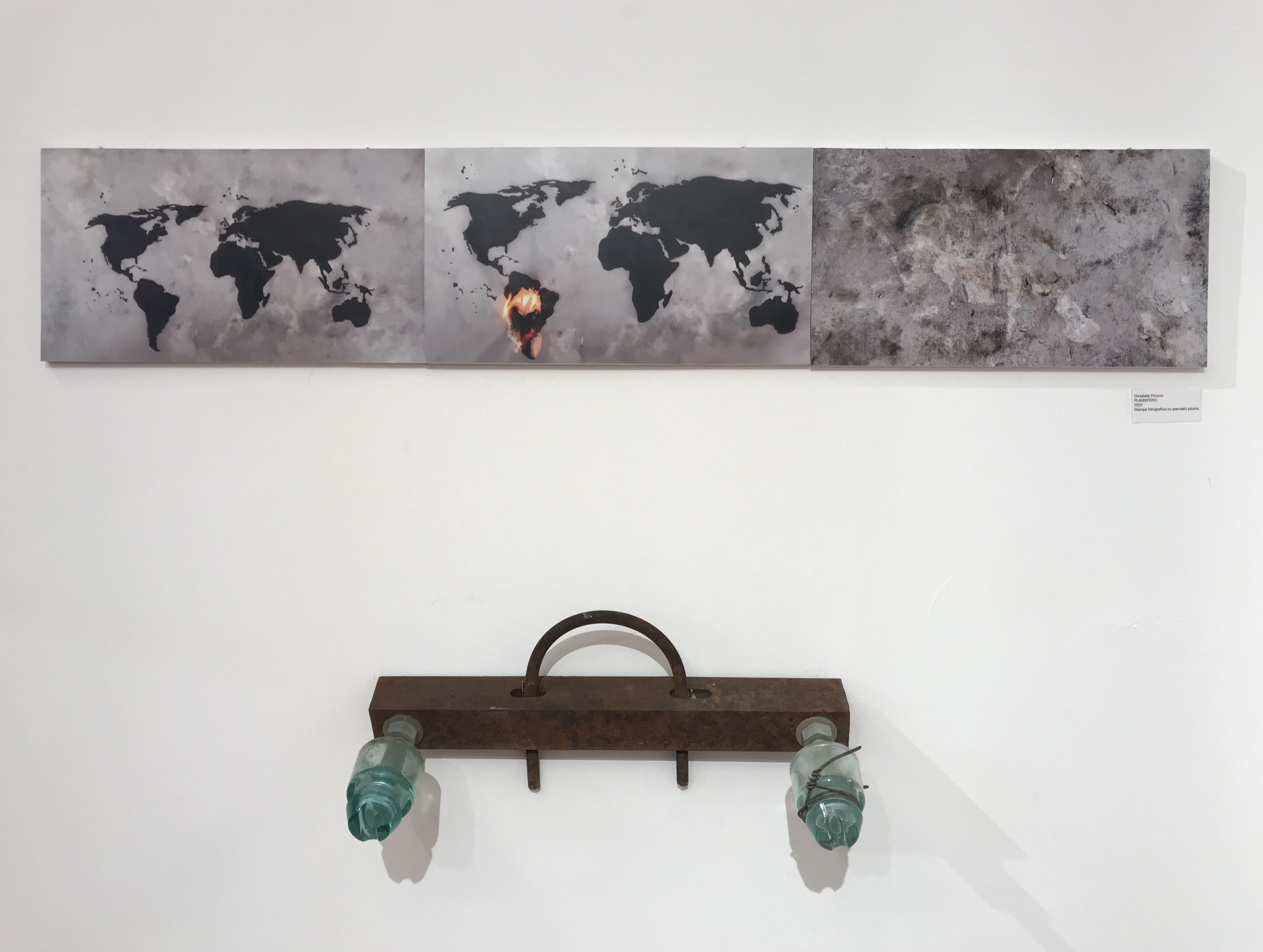 Donatella Pinocci con AEQUILIBRIUM e NATURA RADICALE allestisce due sale espositive comunicanti. NATURA RADICALE è un’installazione di foto e video che rappresenta un planisfero disegnato in china su carta da lucido che brucia. L’incendio divampa da una fiamma accesa in corrispondenza della Foresta Amazzonica. Il fuoco cancella tutto ridisegnando nuove geografie di vuoto.