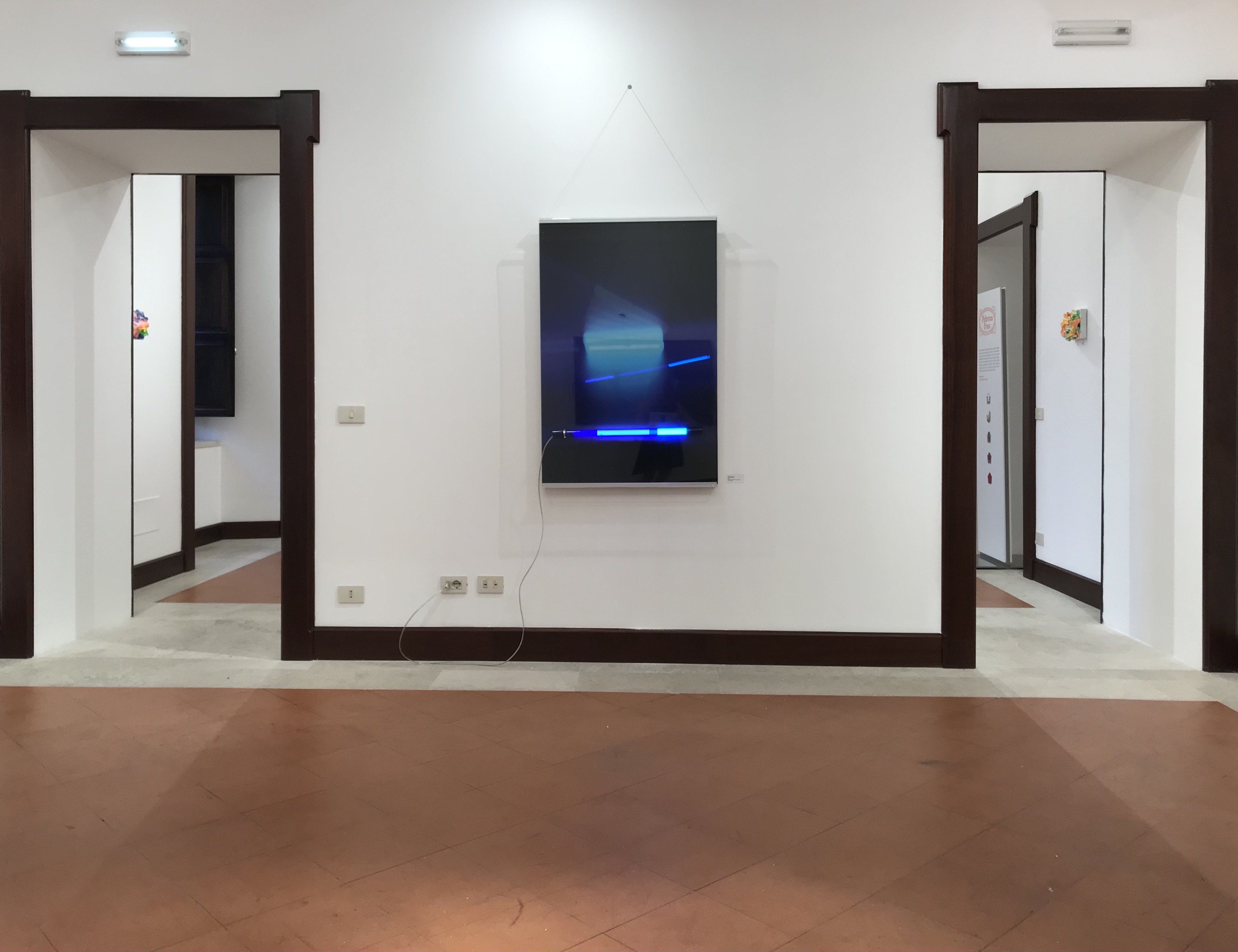 AEQUILIBRIUM rappresenta lo sforzo degli esseri viventi impegnati a voler raggiungere un equilibrio per adeguarsi al continuo mutare delle situazioni esterne o interiori. La livella a bolla/ballance ne rappresenta il simbolo. Una bolla d’aria sospesa in un liquido diventa simbolo del respiro, che contestualizzato tra onde e frequenze, tende a equilibrarsi di continuo. Il fuori perturbante viene estremizzato fino al concetto di vibrazione terrestre che si propaga nell’aria, nell’acqua e nella luce. La luce blu, prodotta da tubolari led rivestiti di gelatine, rappresenta ciò a cui tendere in questo percorso da funamboli che è la vita per tutti gli esseri viventi.