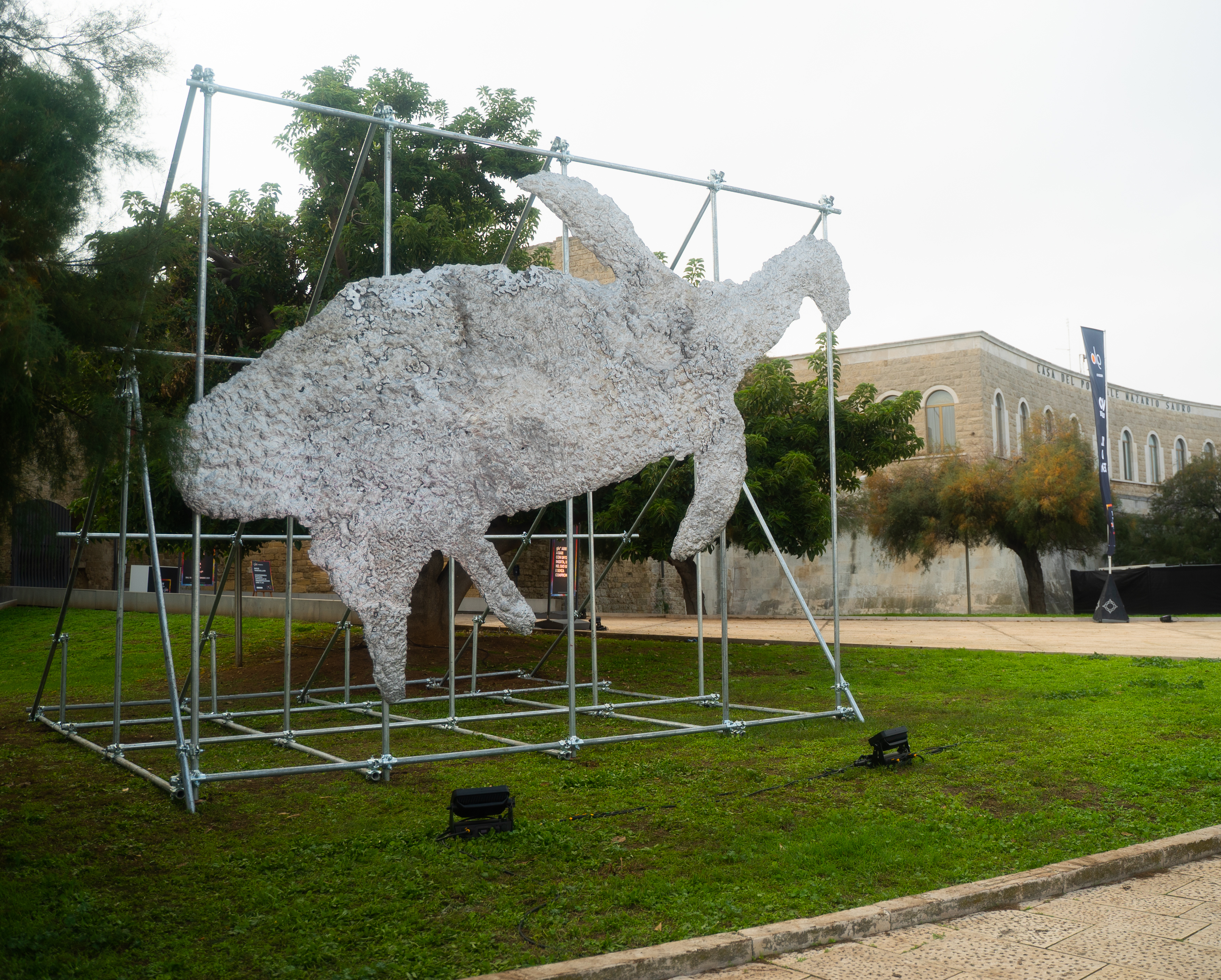 Per Catania, invece, l’artista ha lavorato alla trasposizione di un pittogramma di un’antica specie di delfino (10.000-6.000 a. C.), rinvenuto nella Caverna del Genovese alle Isole Egadi. «È un’opera nata, almeno a livello teorico, durante il primo lock-down. In un momento di sconforto e insicurezza ho trovato che potesse essere “utile” immaginare di non poter uscire di casa, rimanendo al riparo dal mondo esterno, come se vivessi asserragliato in una caverna. Nell’affrontare questa situazione mi sono chiesto con quali elementi, materiali avrei potuto lavorare e i primi sono stati la farina e l’acqua. Ho iniziato, così, a riprodurre piccole sculture primitive, pensando che un giorno sarebbero potute diventare enormi, nel tentativo di ridimensionare l’uomo rispetto alla natura: com’era all’alba dei tempi e, come immagino sarà, al suo tramonto», afferma Nico Vascellari.
