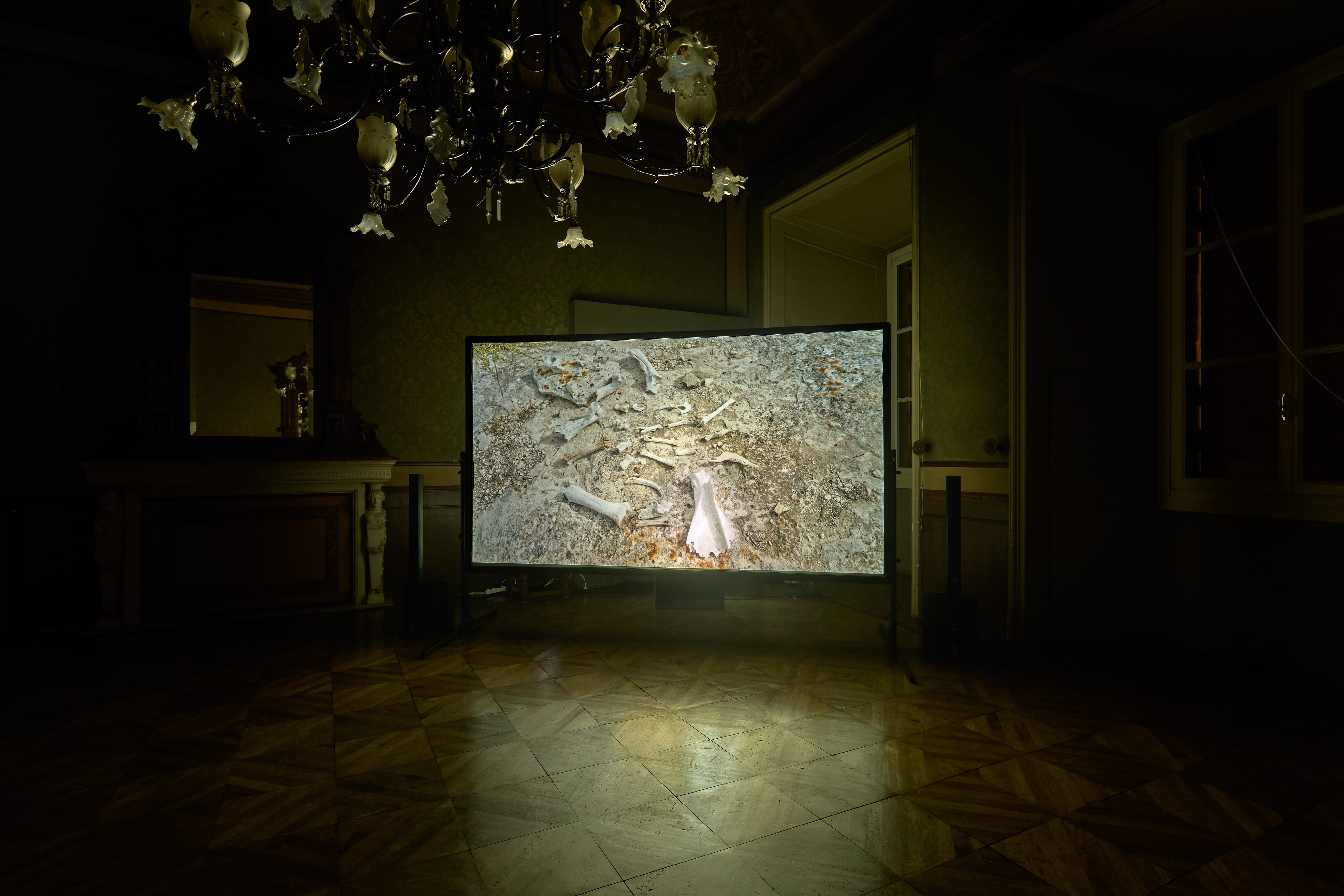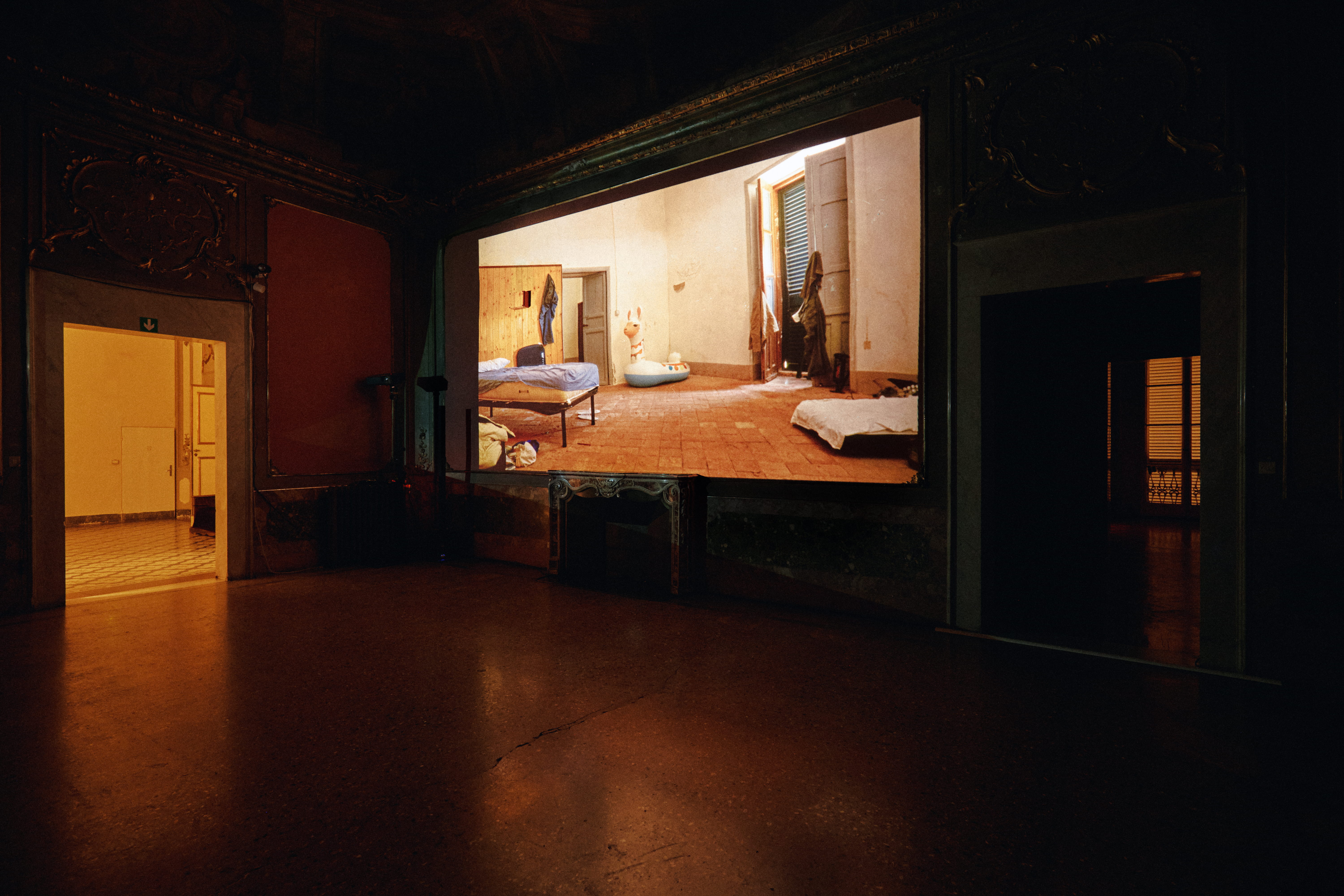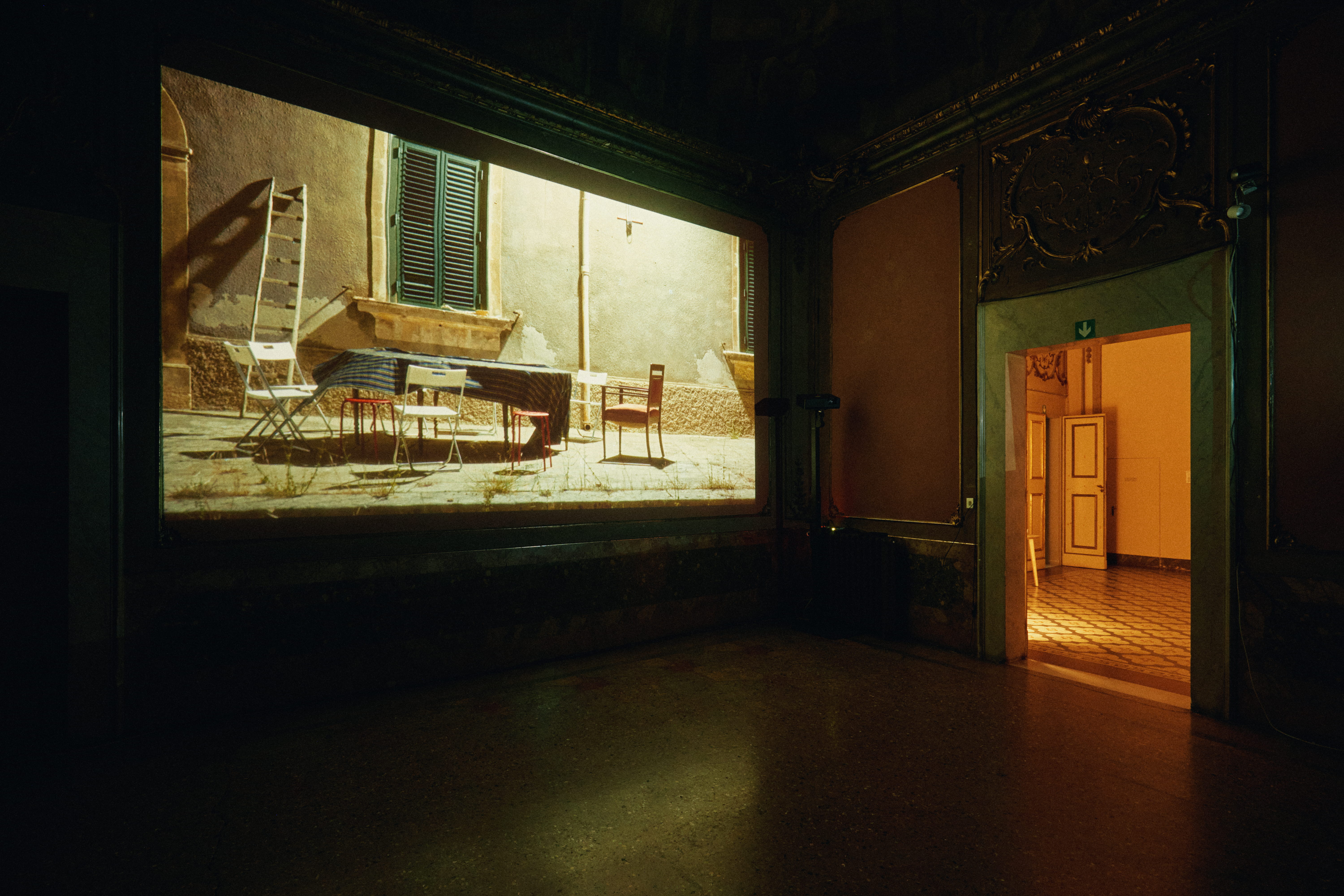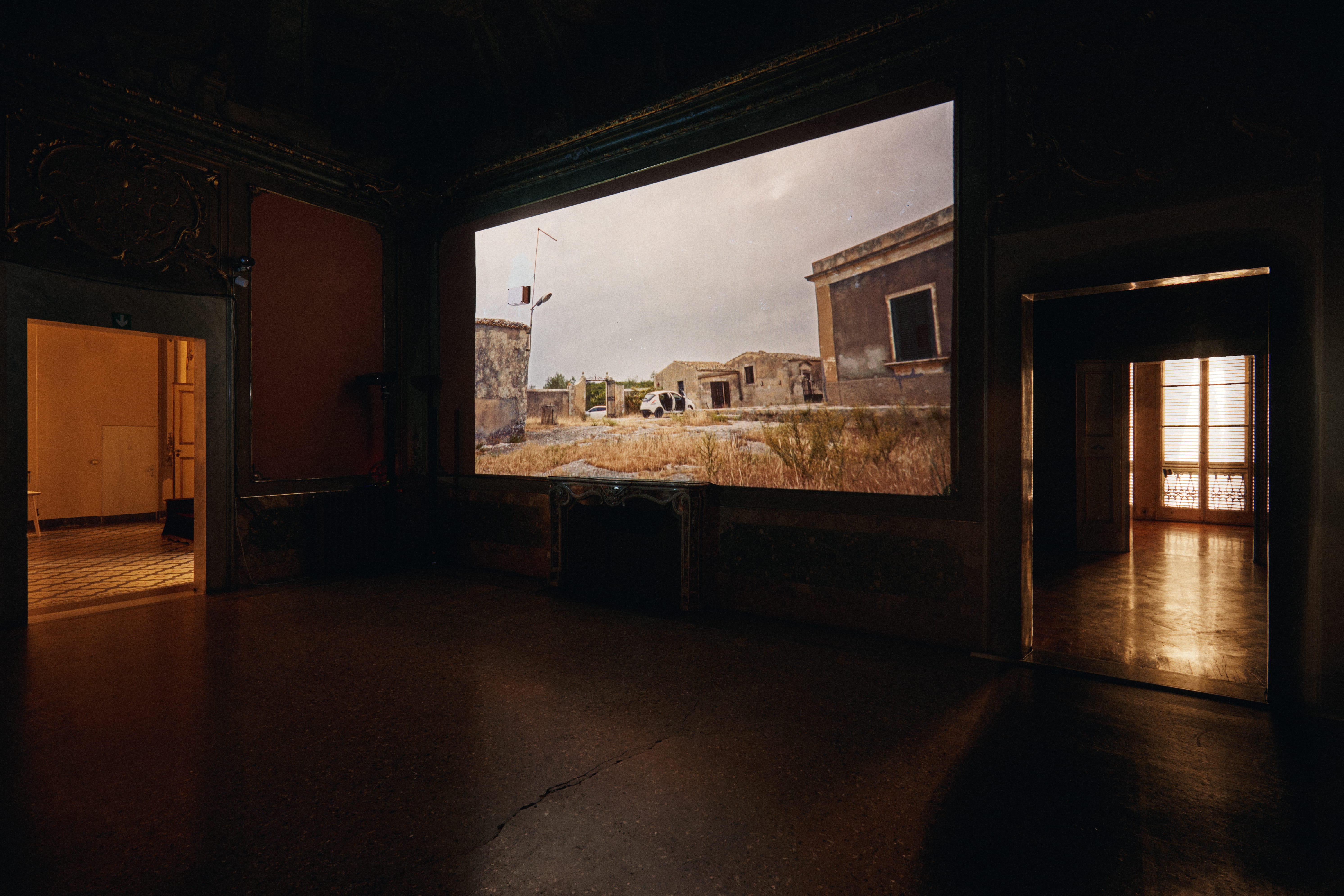 La mostra Selvaggi a Noto riprende dalle arti visive l’attitudine installativa nella fruizione dei video ed è costruita attorno a una regia audio pensata come partitura polifonica. Il film e la mostra condividono la centralità del suono: il visitatore scopre parti del girato seguendo voci, rumori e fruscii nelle stanze settecentesche di Alchemilla, tra loro intenzionalmente comunicanti. In ogni ambiente l’audio è presente in differenti sfumature – quella fisica del parlato, quella più astratta legata a una dimensione empirica del suono, quella “randomica” in relazione all’ambiente esterno e quella “indistinta”, propria della natura invisibile degli elementi.