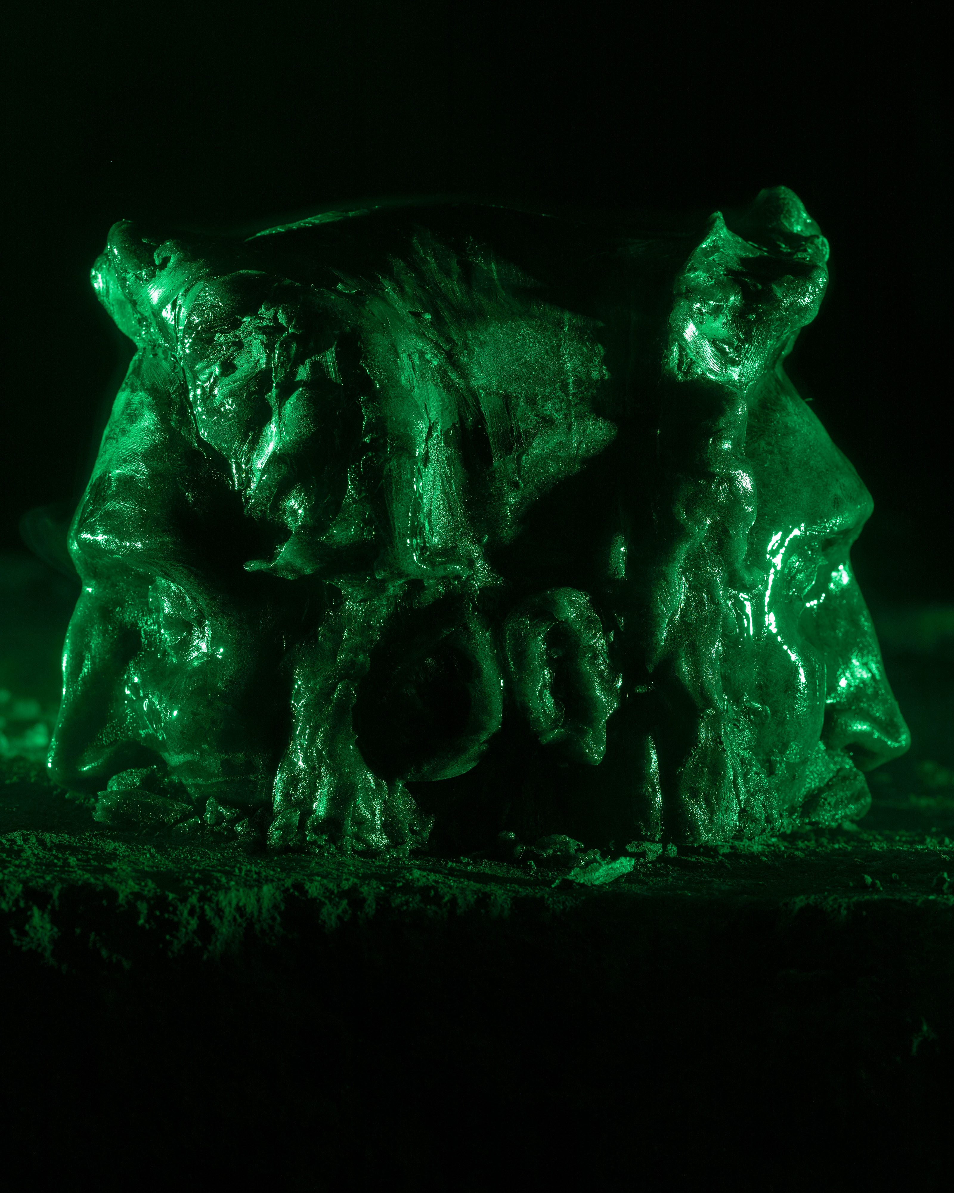 «Assolutamente, la data del 21 giugno è un elemento simbolico per il progetto. Il solstizio d’estate, momento in cui il sole inverte la propria marcia diminuendo lentamente la sua forza, era interpretato in epoche pre-cristiane come un momento di sospensione in cui aleggia la fine delle cose conosciute e il giungere di un mondo ignoto. Per questo motivo nei sotterranei è presente una sorta di reperto archeologico raffigurante Giano Bifronte (divinità dai tanti significati ma sicuramente preposta alla sorveglianza delle porte spazio/temporali e quindi anche dei solstizi). Ho trovato molto poetico che l’installazione fosse realizzata in ghiaccio nero (una vera e propria agency non vivente) e che la sua liquefazione performativa, andasse lentamente a cancellare i lineamenti umani di Giano, trasformandolo in una presenza indefinita e lentamente in una mostruosa poltiglia nera, lasciando aperte tante chiavi interpretative sul futuro».