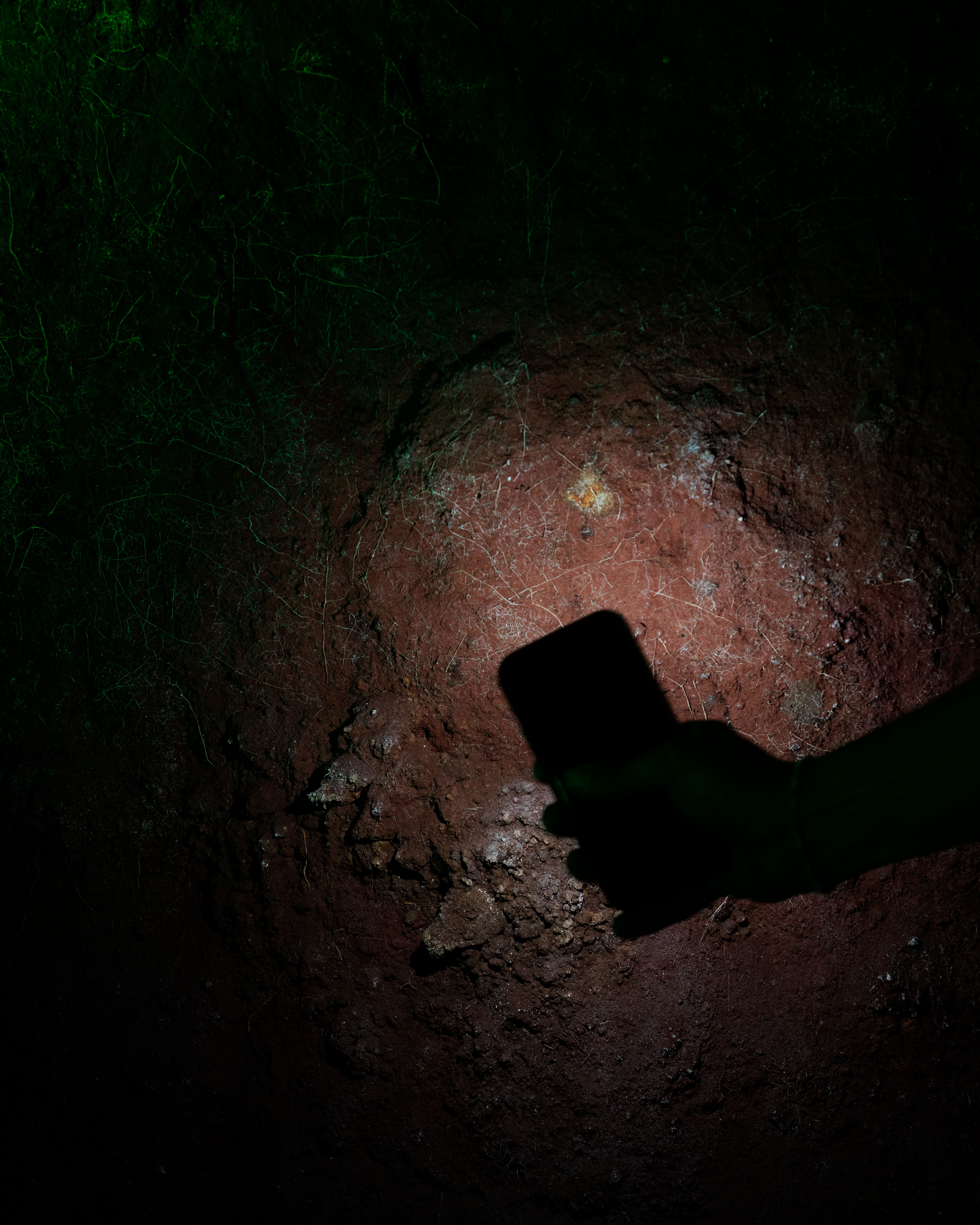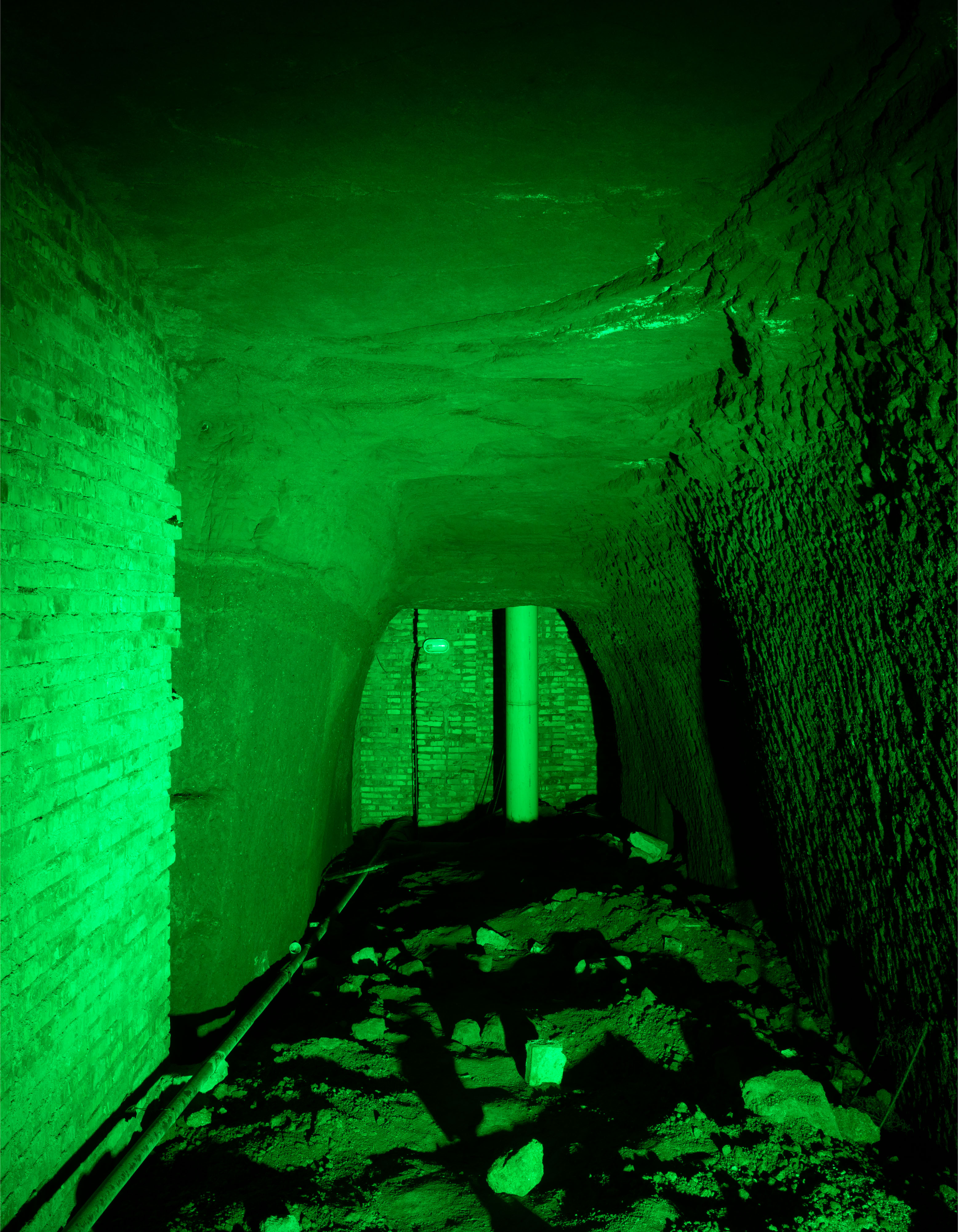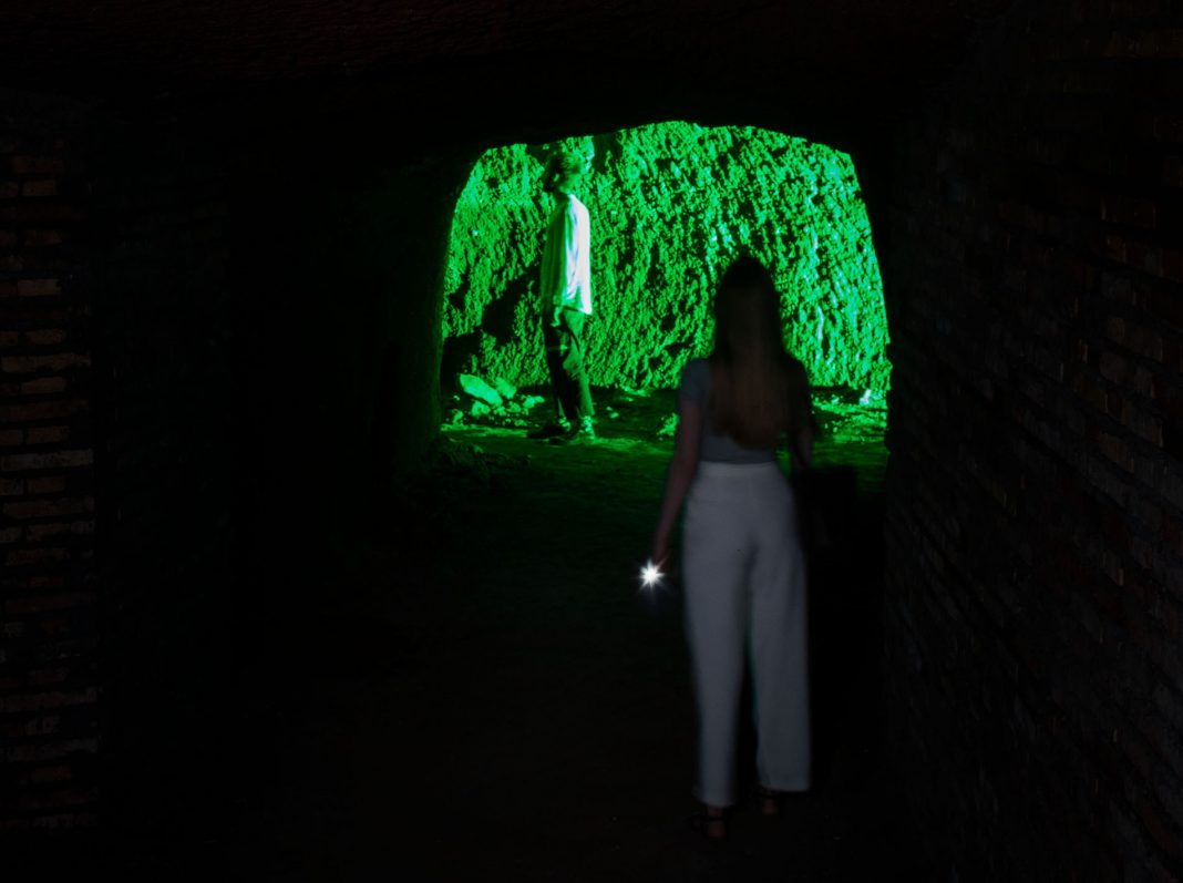 In un ambiente del tutto sospeso, dove l’agire umano sembra essere stato interrotto bruscamente, sorgono riflessioni sulla decadenza di una visione antropocentrica e sulla transitorietà dell’esistenza umana. Greg Jager interviene lasciando intatto lo spazio stesso; sono i lunghi cunicoli scavati nel tufo e il pavimento terroso a parlare della nostra natura effimera. Le piccole luminescenze delle torce degli smartphone aiutano gli ospiti nel loro incerto attraversamento, in lontananza delle luci verdastre aprono alla possibilità di addentrarsi in cunicoli laterali e stanze nascoste.