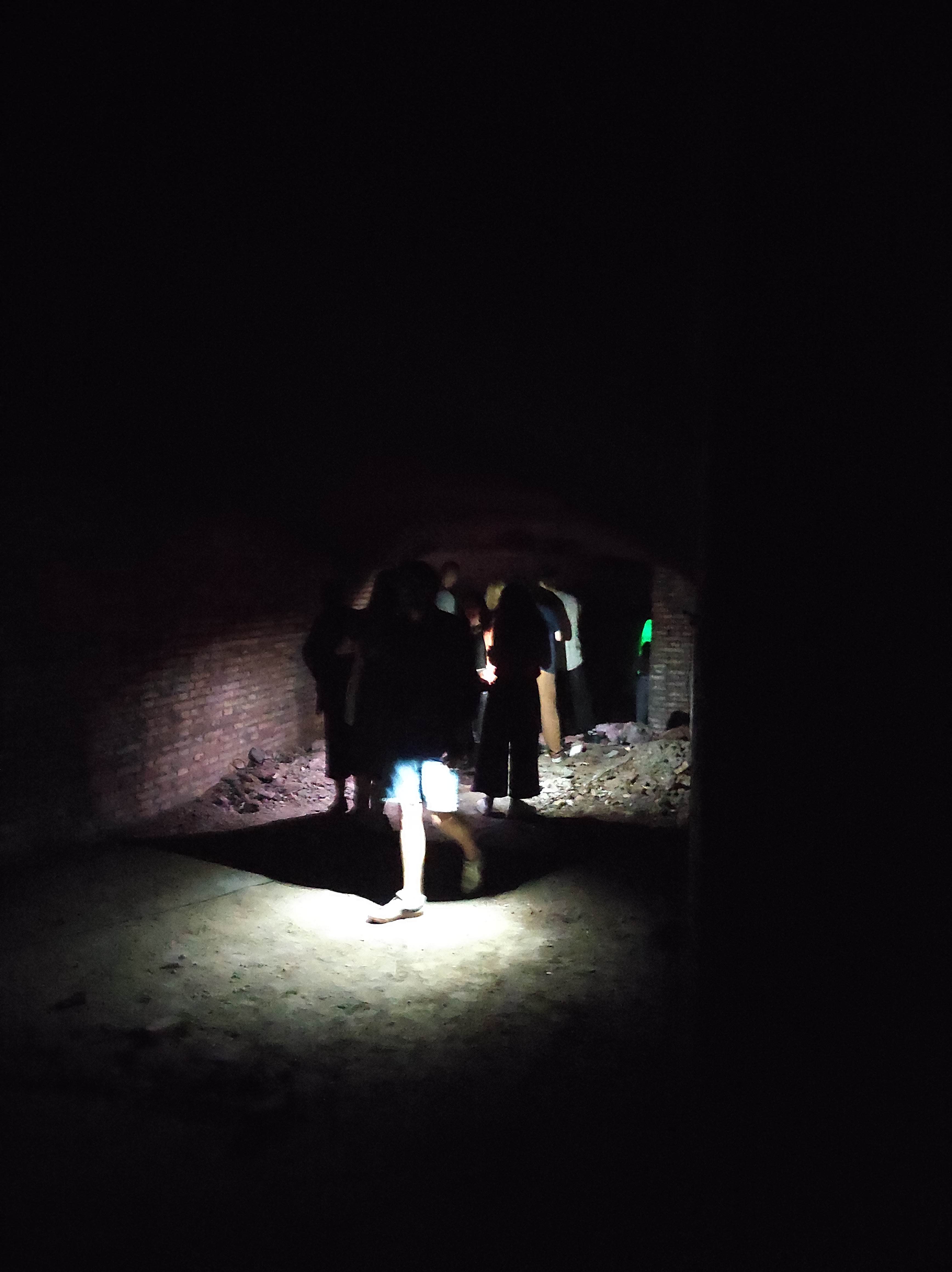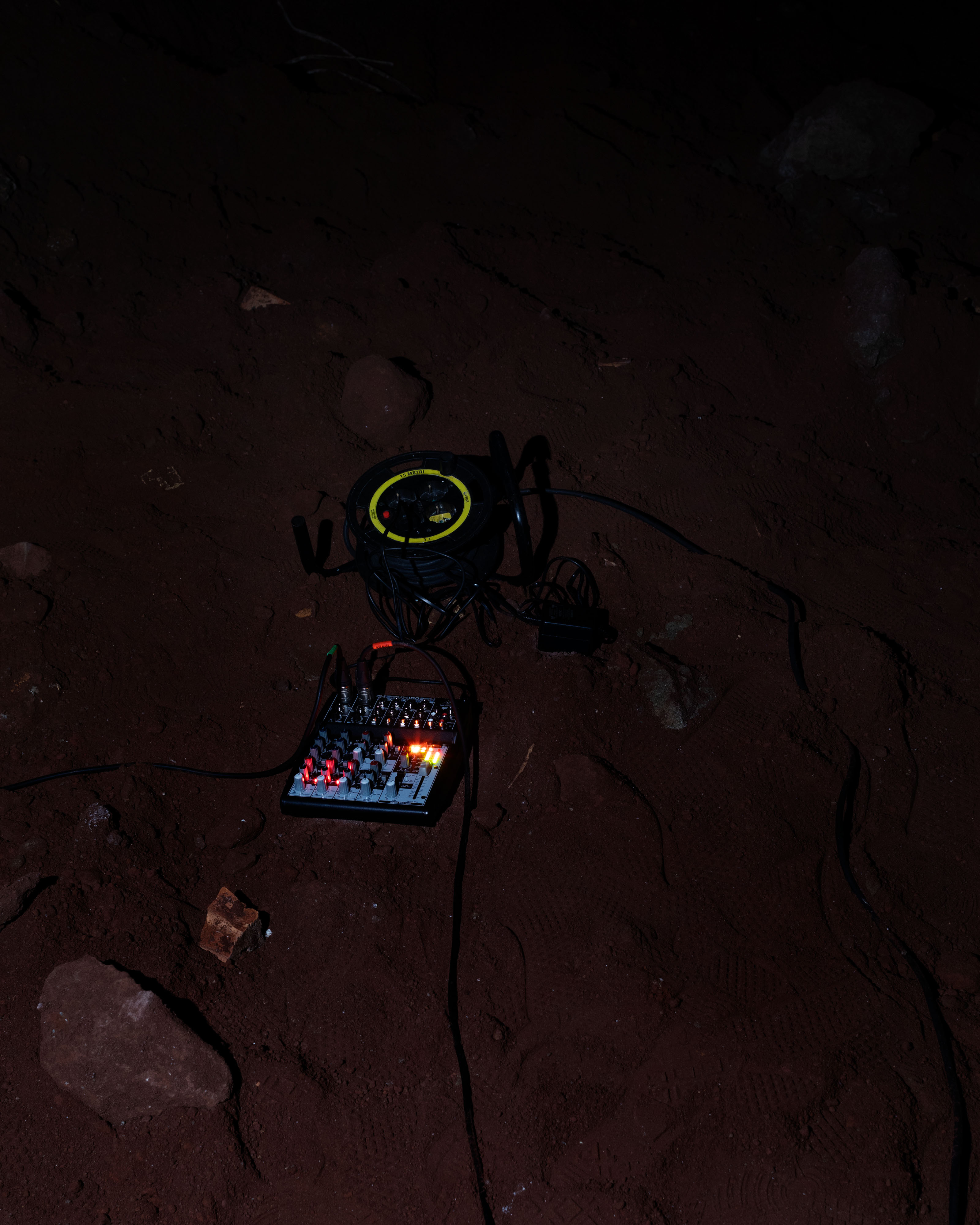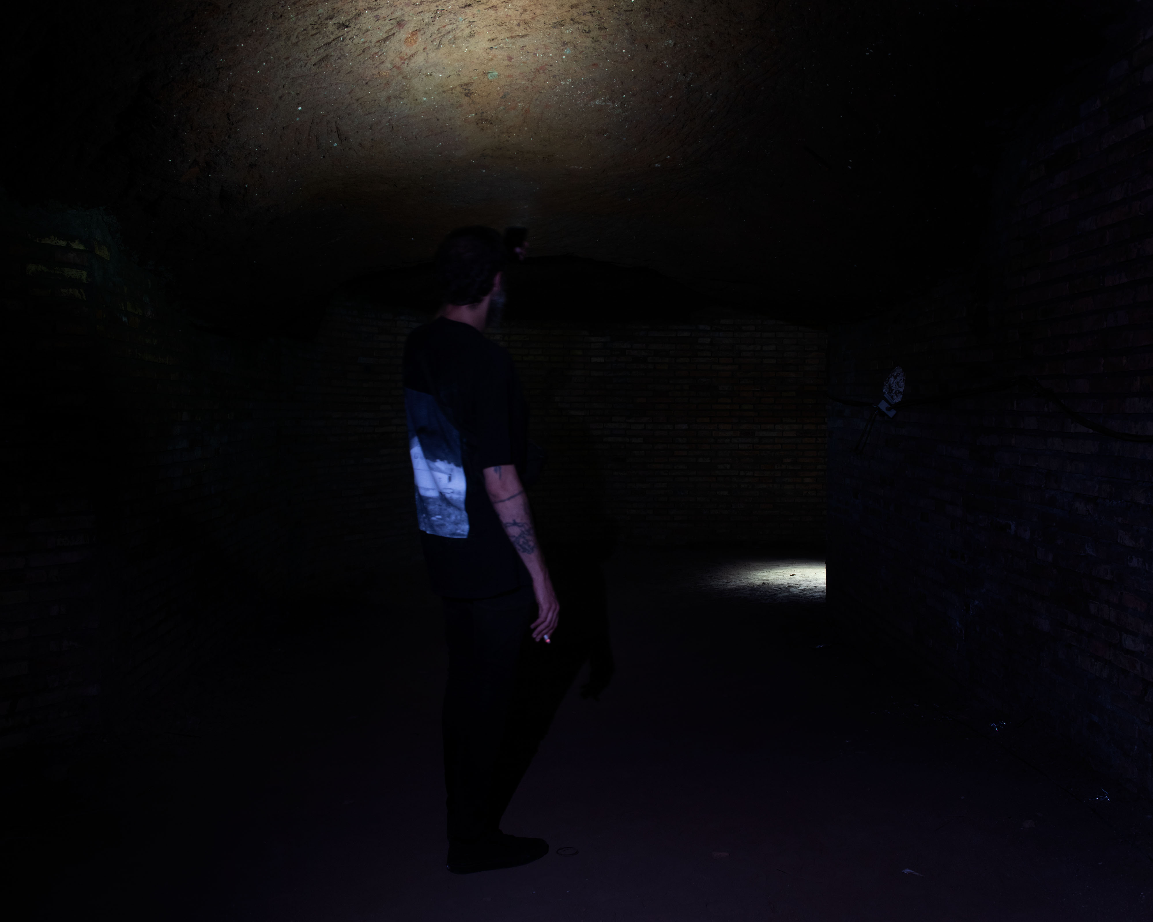 In un ambiente del tutto sospeso, dove l’agire umano sembra essere stato interrotto bruscamente, sorgono riflessioni sulla decadenza di una visione antropocentrica e sulla transitorietà dell’esistenza umana. Greg Jager interviene lasciando intatto lo spazio stesso; sono i lunghi cunicoli scavati nel tufo e il pavimento terroso a parlare della nostra natura effimera. Le piccole luminescenze delle torce degli smartphone aiutano gli ospiti nel loro incerto attraversamento, in lontananza delle luci verdastre aprono alla possibilità di addentrarsi in cunicoli laterali e stanze nascoste.