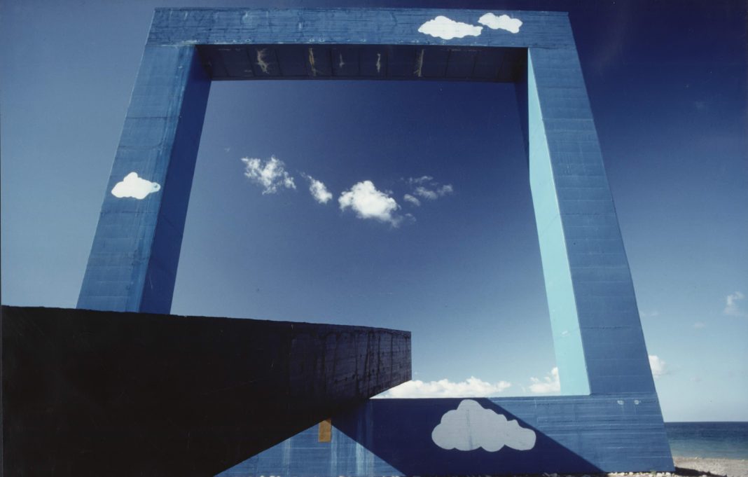 Nel primo caso si tratta di un’opera imponente e spettacolare realizzata sulla spiaggia di Villa Margi (comune di Reitano) che inquadra il mare in una cornice in cemento armato gigantesca in memoria di quella finestra cui Festa ha lavorato per molta parte la sua ricerca visiva. Questa cornice azzurra su cui sono dipinte delle nuvolette pop (altro elemento ricorrente nella pratica dell’artista) ci induce a gettare uno sguardo sull’infinito, interrotto solo (quasi come un monito) dal monolite scuro che attraversa e trapassa la base dell’opera indirizzando lo sguardo.