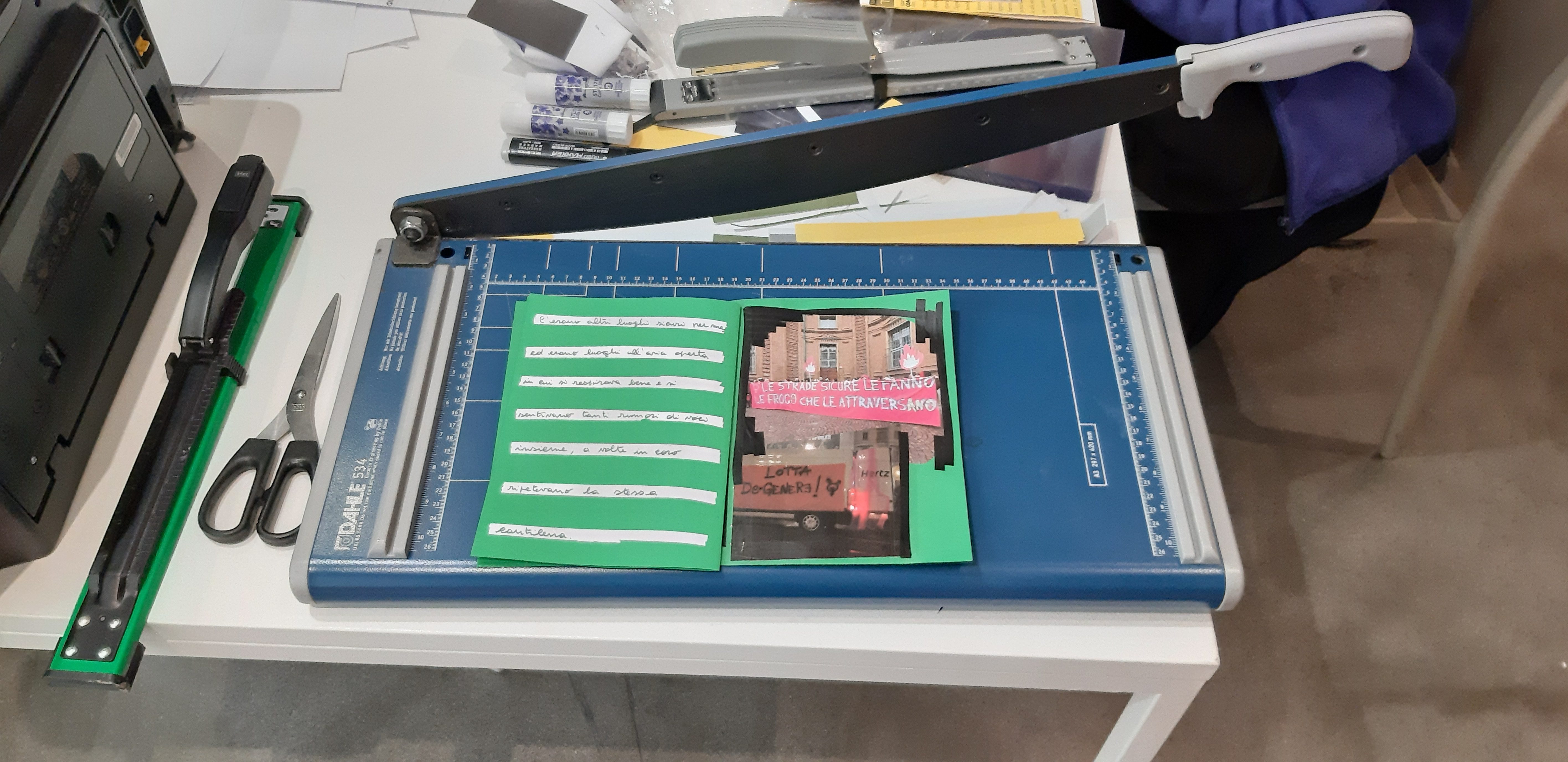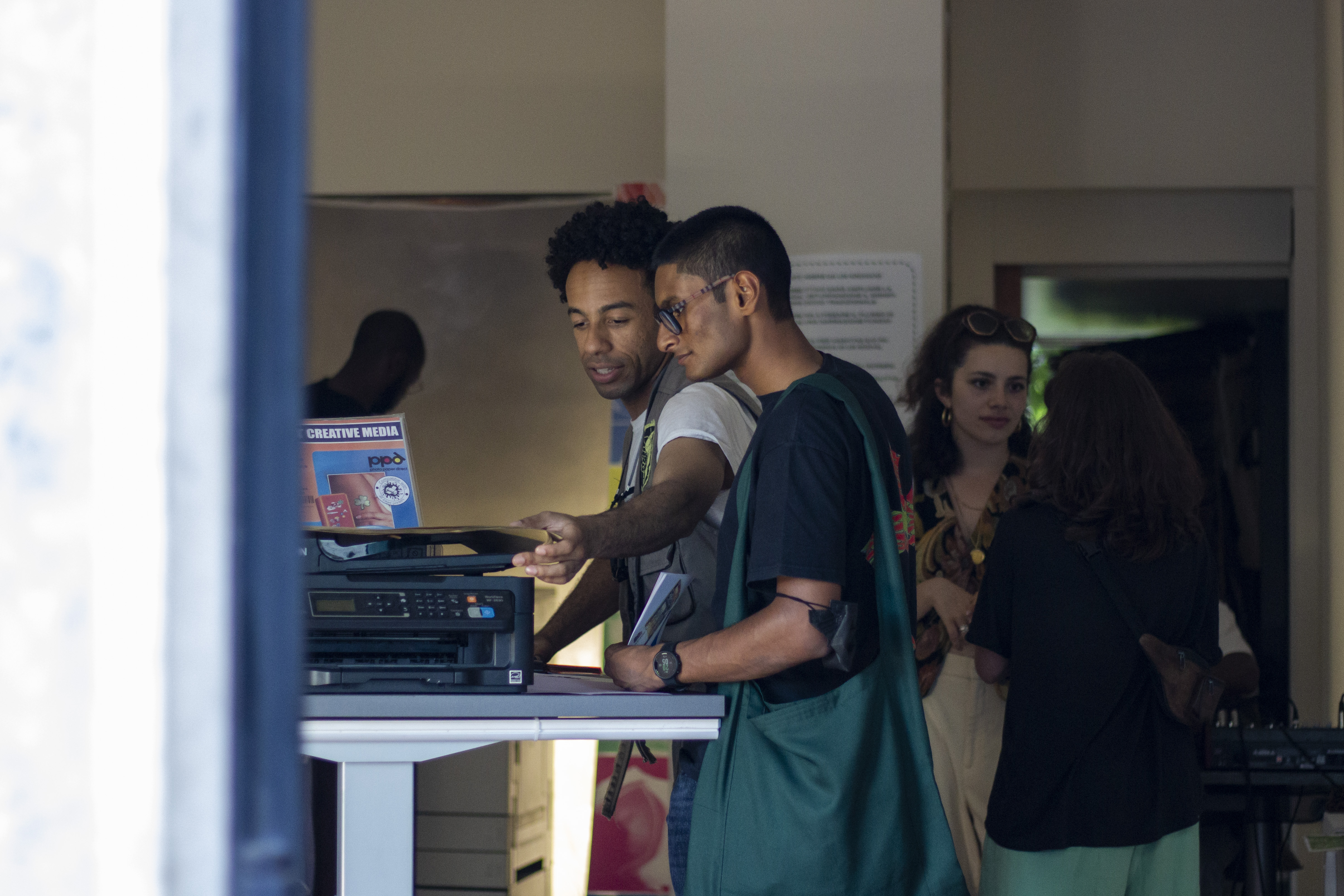 Nwachukwu propone un’azione collaborativa di due giorni finalizzata alla realizzazione di una pubblicazione in divenire. Il primo giorno, articolato in due turni, la vetrina diventa un presidio aperto: un luogo in cui documenti nascono, vengono copiati, manipolati e messi in circolazione. Fotocopiatrice e stampanti – tecnologie elementari, quasi residuali – sono il cuore operativo di un laboratorio anti-lineare, che rifiuta gerarchie e metodologie consolidate per favorire una condivisione orizzontale dei saperi legati alla stampa e all’editing.