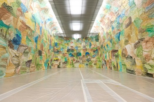 Vale assolutamente una visita al PAC la sala di Zhang Enli (nella foto di home page l’intervento all’ICA), uno degli artisti più importati nella Repubblica Popolare in questo momento, che ha dipinto site specific – in un atto liberatorio – il suo space painting, con una grande ritmicità. Anche in questo caso un’immagine di scrittura, che riprende i colori dell’ambiente.
