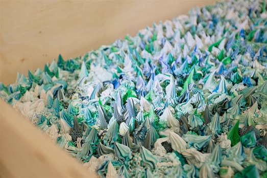 Proseguendo, dopo l’incisione, da sottolineare c’è l’olio di Xu Zhen, le cui opere sono state mostrate recentemente anche ad Art Basel: un dipinto sui toni del verde, decorativo e che guarda proprio alla pittura occidentale: i tubetti di colore sono stati spremuti sulla superficie attraverso saccapoche per i dolci: un effetto “meringa” barocco, che racconta con lo sguardo cinese anche il grande mercato dell’arte contemporanea, dove la preziosità sembra misurarsi anche in base ai chili di materia usata, al costo del supporto. Di Xu Zheng anche tre vasi dall’immagine preziosa che parlando di un altro gesto rivoluzionario: l’artista piega loro il collo di 90 gradi, creando un bizzarro spaesamento che richiama anche alla mente la storia dei falsi, il ribaltamento della storia.