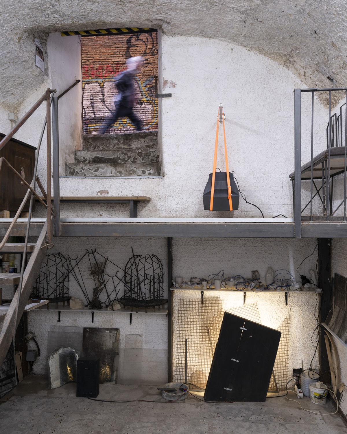 La scelta di eliminare le didascalie in primo piano rafforza questa impostazione. Chi entra nello spazio è chiamato a orientarsi senza mediazioni forti, affidandosi all’intuizione, alla percezione, alla scoperta. Il significato non è dato, ma emerge come possibilità, come costruzione temporanea che nasce tra le opere, gli oggetti residuali e l’archeologia stessa dello spazio.