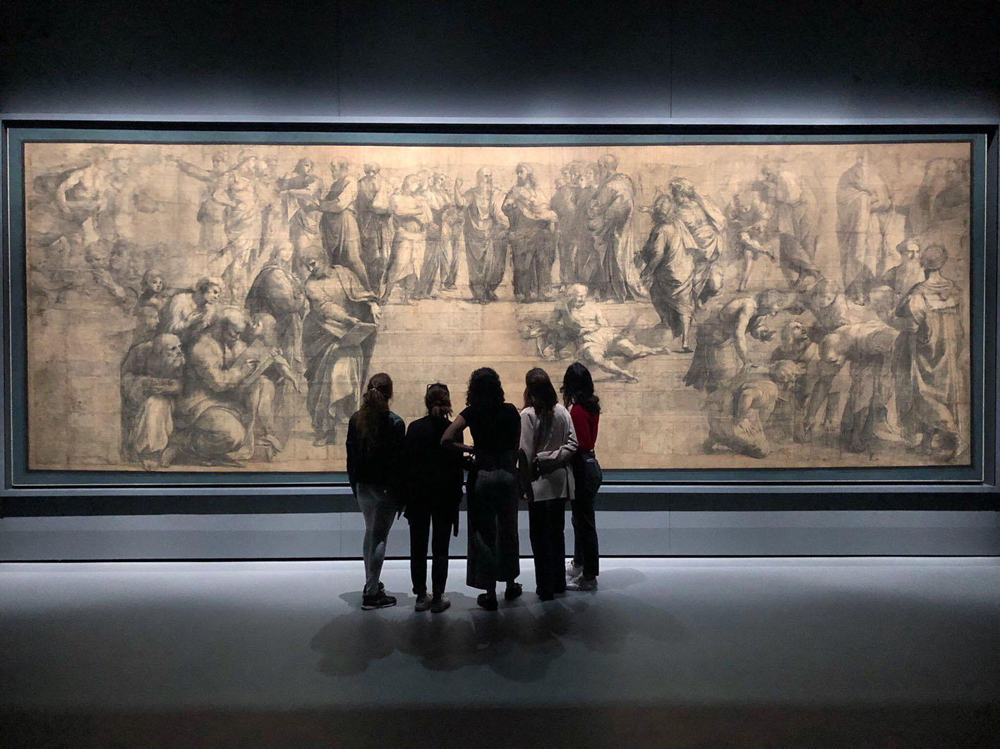 Il disegno mostra uno degli ultimi stadi del processo di ideazione della Scuola di Atene, una delle opere più famose e allo stesso tempo più complesse, sia da un punto di vista tecnico che iconografico, realizzate dal genio urbinate: un meraviglioso manifesto culturale della sua epoca. La collocazione stessa, all’interno di una stanza le cui pareti furono affrescate, secondo uno schema iconografico molto sofisticato, con scene religiose che si alternano a temi pagani ne è testimonianza: un perfetto sincretismo del mondo antico con quello cristiano, la creazione di un ambiente intellettuale, più che religioso, dove personaggi della cultura classica convivono e dialogano con quelli della cristianità.