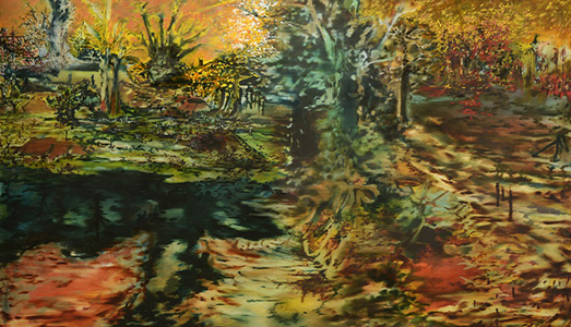 Di pittura si occupa Francesco Zanatta, che in residenza alla Giudecca tira fuori da alcune ricognizioni fotografiche realizzate in aree dismesse delle campagne venete, campi e zone incolte o vituperate dalla mano dell’uomo e poi abbandonate in attesa di nuovi ripristini, paesaggi su tela al limite tra l’onirico e lo psichedelico. Nei suoi quadri le proporzioni vengono rimescolate come l’olio, senza un preciso punto di vista, e i grovigli colorati – queste strane selve oscure di pittura – nascono direttamente sul supporto. «Lavoro inserendo una traccia iniziale, ma quello che mi interessa è l’esperienza con il luogo», ci spiega l’artista, riportandoci all’idea di una pittura site specific.