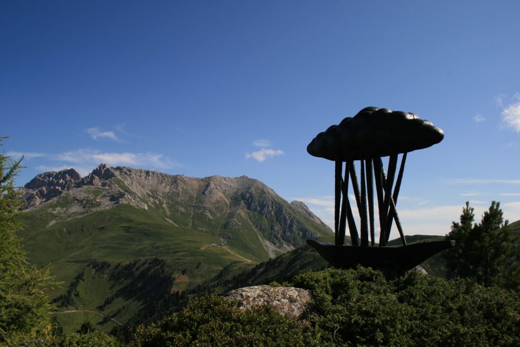 Spostandosi dall’Arcanuvola di Elio Vanzo, composta simbolicamente da una nuvola che scende la pioggia, in forma di solidi pali acuminati, e da una barca che la raccoglie nel ventre – inducendo, in chiaro riferimento biblico, un profondo senso di salvezza, per l’uomo e per la Natura – è possibile raggiungere l’inedita opera di Marco Nones, realizzata e installata in occasione della nuova edizione. Conifera, che è stata creata con legno di abete bostricato – ovvero colpito dal parassita bostrico tipografo attraverso cui Nones vede straordinari e possibili nuovi utilizzi nell’arte come nel design – svetta con i suoi 6 metri di altezza all’arrivo della seggiovia, consentendo sosta e riparo al suo interno.