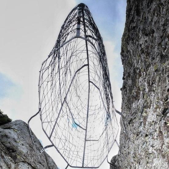 È innegabile pensare alle cause degli agenti atmosferici che ogni giorno, di ogni stagione, sfiorano, toccano o accarezzano tutte queste opere. Ma perdendoci in questo panorama possiamo accogliere il senso più profondo dell’affidarsi, del lasciarsi e lasciare andare: è la vita stessa in continua trasformazione, il cambiamento non è da temere. Da qui, sul versante sinistro del giro ad anello, Jano Sicura installa una schiera di bozzoli su una scogliera di pietra, abbozzando una crisalide unica, una forma di vita possibile, che conduce a una misteriosa cupola in ferro, dalle linee e geometrie aliene, che sempre lei, nel 2023, ha incastonato tra due grandi pietre come a costruire un punto di sosta sotto l’immenso cielo aperto.