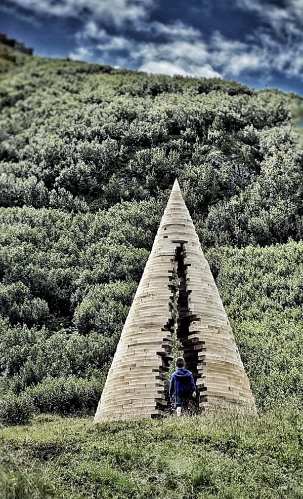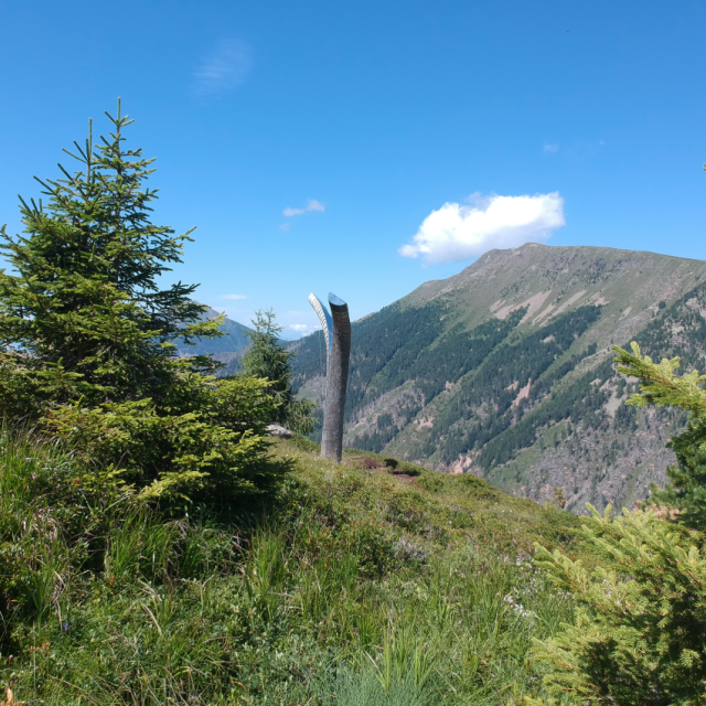 Da qui, muovendo verso destra, un pastore della Val di Fiemme, scolpito con il cirmolo, in intimo dialogo con il proprio cane, abita il parco mantenendo fermo lo sguardo verso Sud (Mediterraneo, Elio Vanzo, 2018), verso le origini, che anche Mariano Vasselai, poco distante e dinnanzi al Monte Cornon, recupera. Con Il nodo della strega (2018) fa memoria di quelle streghe del Cornon che, si diceva, gettassero in strada corde piene di nodi. E chi le raccoglieva doveva ricorrere a loro per essere liberato dal maleficio. Senza alcuna pretesa psicanalitica, è qui che (ri)scopriamo il nostro inconscio: qualcosa che avrebbe dovuto rimanere nascosto, invece affiora. Nella letteratura come in questa esperienza, è tutta una questione di occhi. Forse per caso, forse no, quel che conta è la meraviglia della scoperta, proprio qui si erge l’opera Vedo non vedo di Luca Prosser (2016) rappresentativa di uno sguardo lucido e commosso sulla montagna.