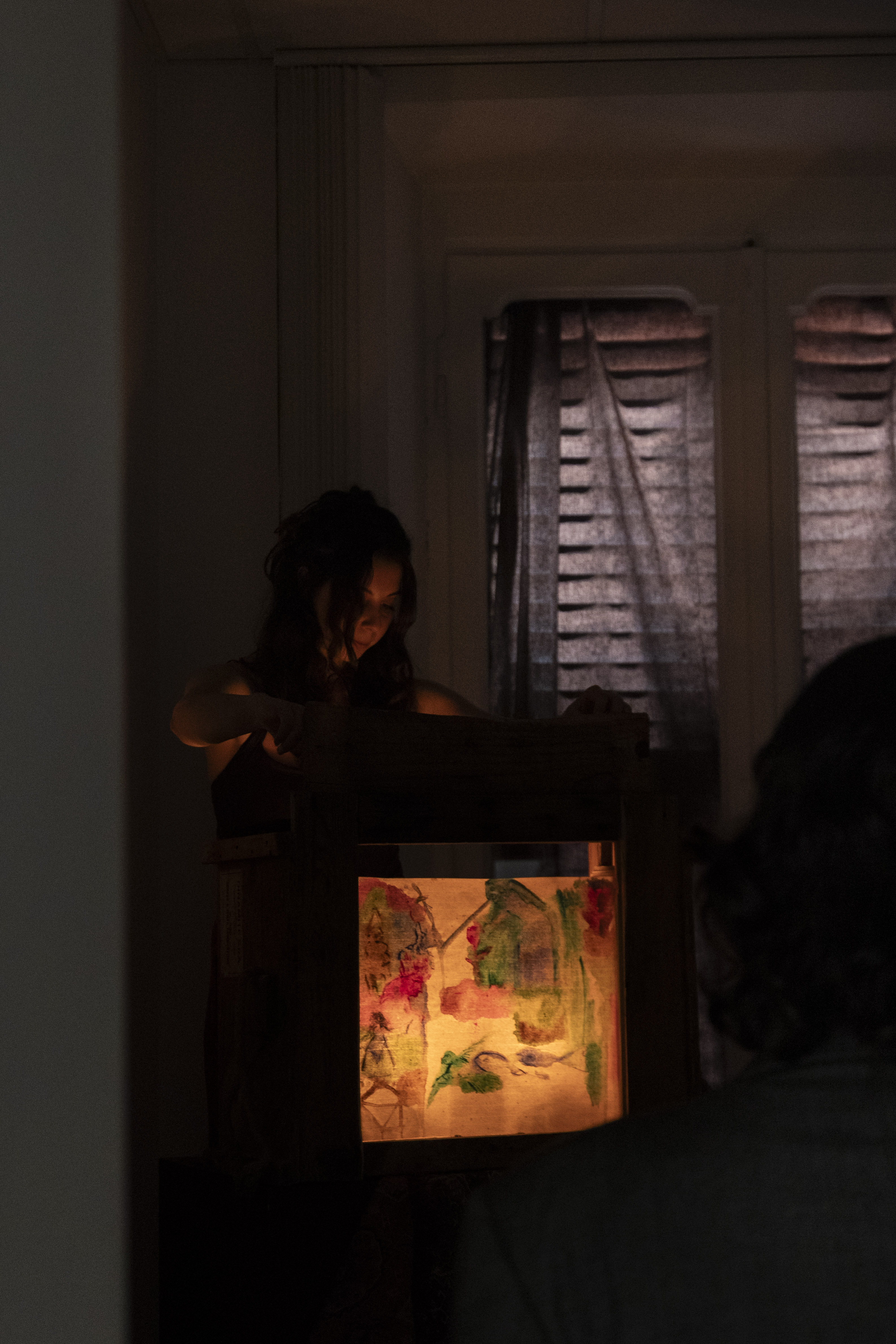 Ilaria Maciocci invece, nella Room numero 2, si esibisce in un ambiente buio, in cui spicca una scatola rialzata da cui emergono lentamente figure stilizzate dal sapore orientale e mitologico. A primo impatto un artista di strada alle prese col suo spettacolo in piazza, ma il suono del carillon, la delicatezza dello scorrere analogico della carta e l’intimità dello spazio evocano un’altra scena: quella di un’infanzia ricordata con nostalgia, di una buonanotte dopo l’ultima fiaba. L’utilizzo di un vero carillon e la sua continua ricarica è un gesto semplice, goffo ma che – rispetto a un automatismo digitale impostato per coprire l’intera durata della performance – si adatta meglio alla situazione e all’idea del progetto in sé, poiché contribuisce a rompere la finzione scenica e a mantenere viva questa oscillazione tra il pubblico e il privato, tra la memoria personale e la rappresentazione.