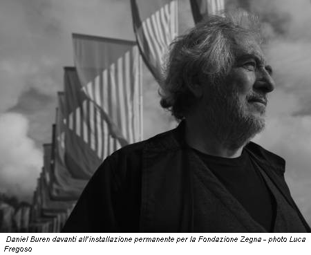 A Trivero, alle porte di Biella, si è inaugurata l’installazione di Daniel Buren allestita lungo il perimetro delle terrazze panoramiche del Lanificio Zegna. 135 drappi di sette tonalità per il nuovo “utensile visivo” dal maestro francese. Mentre piove a dirotto, Exibart si intrattiene con l’artista...