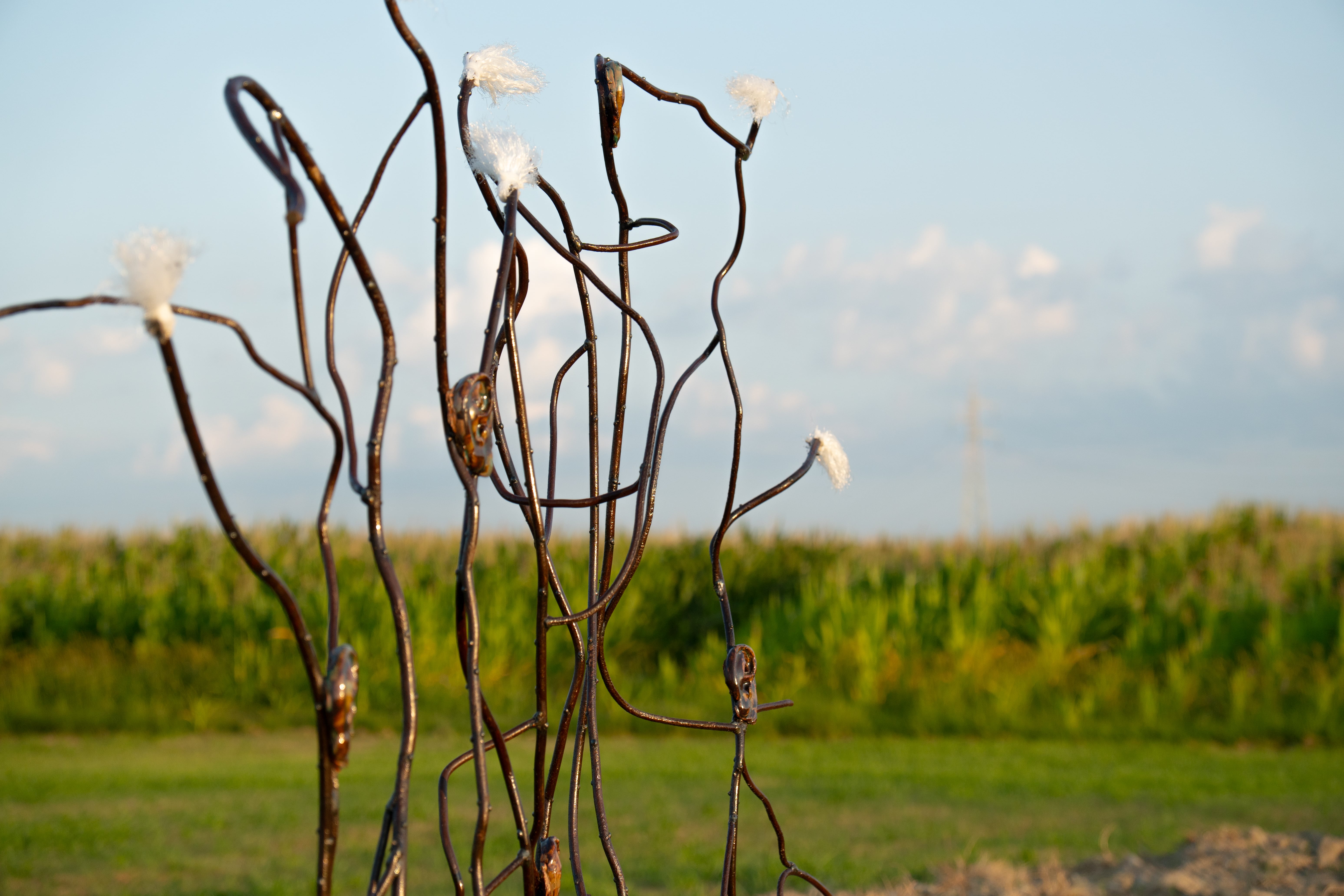 Arianna Pace ha presentato Il corpo è un organo per affondare nell’esterno, come pietra, lichene, foglia, installazione ambientale allestita in un campo agricolo, dove sculture verticali composte da ferri di scarto e ceramiche poetiche delineano una costellazione che mescola naturale e antropico, evocando il paesaggio ibrido del Delta. L’opera è stata attivata da una performance dell’artista Isabel Paladin, amplificando l’aspetto sensoriale e simbolico dell’installazione.