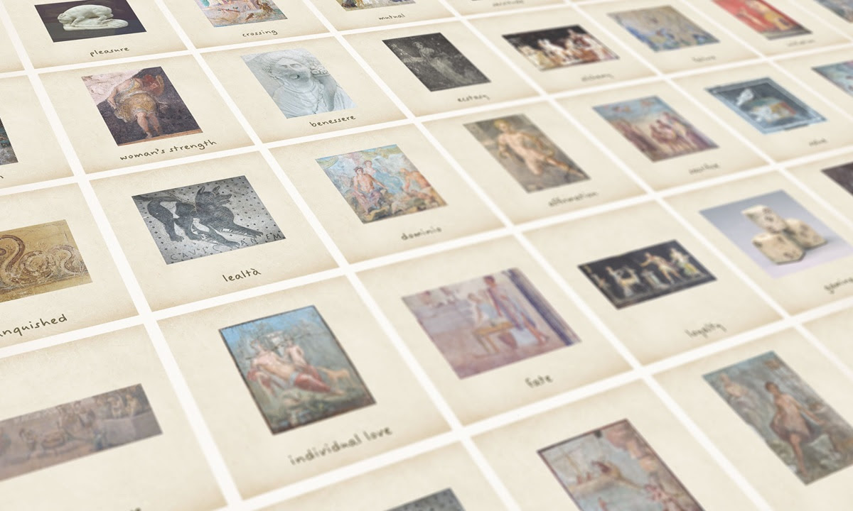 Allora & Calzadilla sono partiti dalla constatazione dell’onnipresenza di emoji e sticker nelle nostre conversazioni quotidiane, elementi ormai imprescindibili per esprimere concetti attraverso un linguaggio universale, al di là delle barriere linguistiche. Così, il duo formato da Jennifer Allora (1974, Philadelphia, USA) e Guillermo Calzadilla (1971, L’Avana, Cuba), che spesso lavora sull’intersezione tra i linguaggi e i media, ha elaborato un inedito progetto grafico che abbina immagini di affreschi e manufatti pompeiani accuratamente selezionati, con parole che trasmettono nozioni complesse come solitudine, amore individuale, piacere, lealtà o diffidenza.
