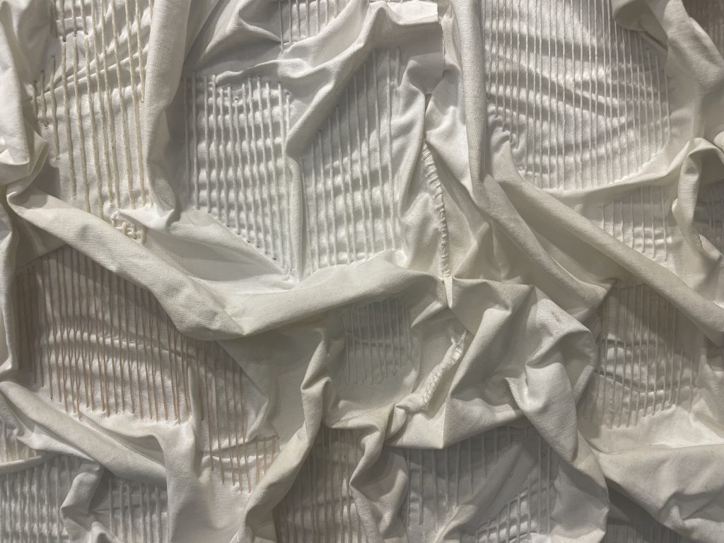 Cosa vi è oggi più attuale della Fiber Art? Poco, forse niente. Dinnanzi a opere in tessuto rosso su rosso, blu su blu, nero su nero, bianco su bianco, non immaginiamo di collocarle così in decenni passati. Eppure erano gli anni Novanta quelli in cui Gillo Dorfles scriveva «… la rigorosa intelaiatura (armatura si potrebbe dire) nuovo medium per realizzare piccole grandi (persino vastissime) superfici in un alternarsi, embricarsi, contrapporsi di ulteriore momenti cuciti, in una sorta di nuove tessiture…». Oggi conosciuta anche come Textile Art, Fiber Work, Art Fabric, Nouvelle Tapisserie e Soft Sculpture, essa ammette un approccio di ricerca molto variegato. Qui ci troviamo di fronte a un esempio di manualità concreta, spoglia di qualsiasi medium pittorico.