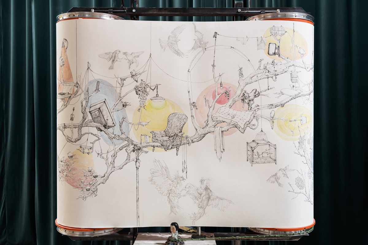 La marginalità come un dispositivo da innescare, anzi, come uno strumento in grado di produrre un suono, cioè un attraversamento. Marginal Carillon è l’installazione polimaterica e multisensoriale di Eugenio Tibaldi, in collaborazione con il sound designer Taketo Gohara, presentata da Collezione Ramo negli spazi di BASE Milano, in occasione della Milano Art Week. Su un rotolo di tre metri di carta – una citazione della storica Collezione Ramo, che raccoglie 700 opere su carta dai primi del Novecento a oggi – Tibaldi ha disegnato un lungo e nodoso ramo, popolato da oggetti urbani, come cestini della spesa e parrucche, e da volatili di ogni specie. Avvolta su due rulli, la carta ruota su se stessa, facendo come da partitura a dei contrappunti sonori, composti da Gohara, che si diffondono nella Ground Hall dello spazio culturale in via Borgognone. Dalla scultura, il cui corpo inferiore è un mobiletto vintage, emergono miriadi di altri elementi estranianti, pezzi di un grammofono e di un giradischi, calici di vino rosso e bianco, un uccello, lampadine, luci, un display con un mixer, un valigia di pelle, tutti segni di presenze, di transiti. E infatti il disegno si attiva, come un carillon, grazie all’intervento dello spettatore: chi si avvicina all’opera innesca una videocamera che rileva la quantità di inchiostro presente sulla carta trasformandosi in nota.