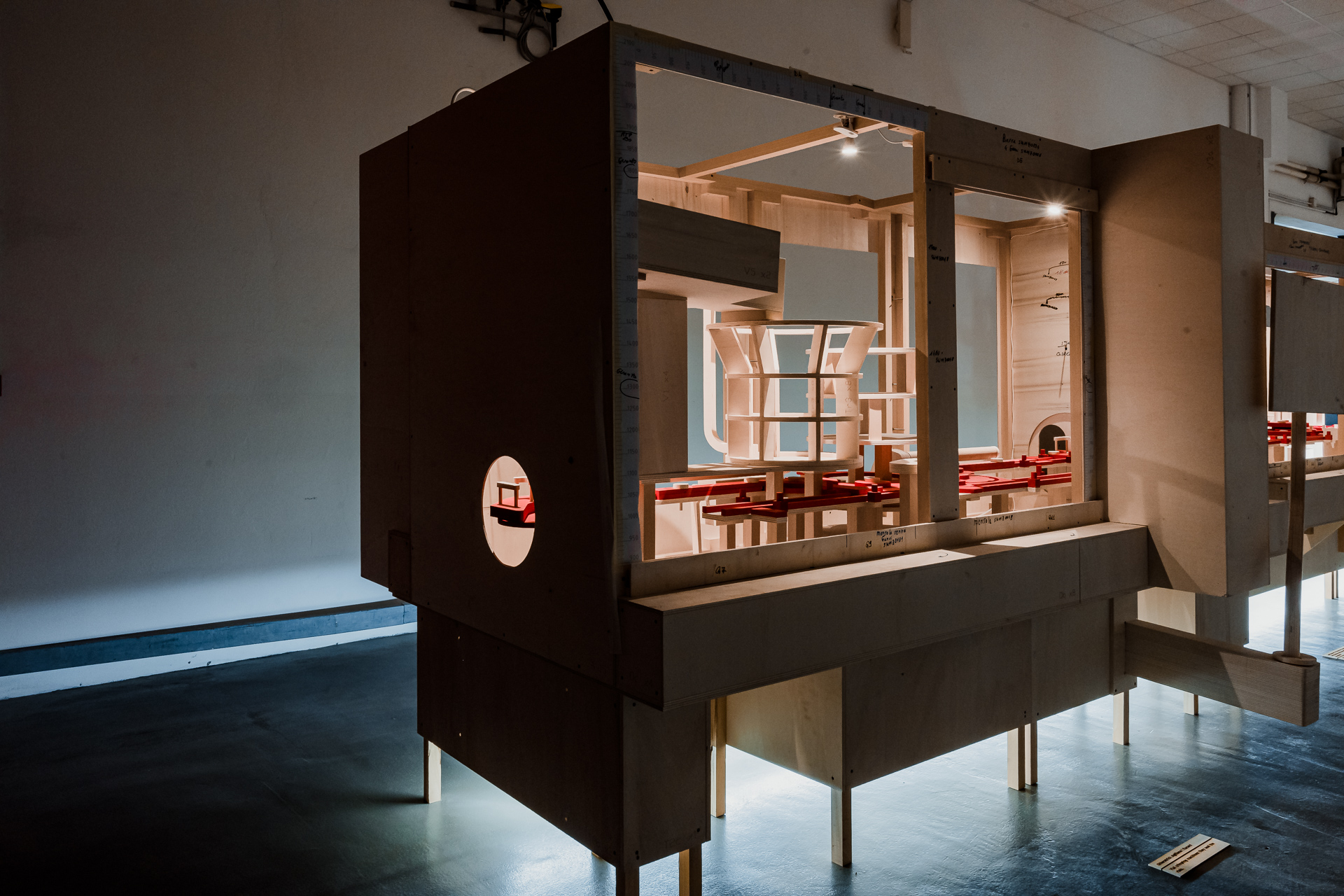 L’ultima sezione della mostra è Future, dedicata al Biotech Center of Excellence di via San Leonardo, di cui si stanno ultimando i lavori. All’interno della seconda sala dell’ex magazzino, si articola un mockup in legno in scala 1:1 della linea industriale destinata al riempimento di flaconi sterili costruito da tecnici esperti, dei quali se ne leggono gli appunti tracciati su tutta la superficie, per testare e ottimizzare il corrispettivo macchinario che sarà presto operativo nel nuovo Biotech Center. Elemento di ultima innovazione e sviluppo dell’Azienda.