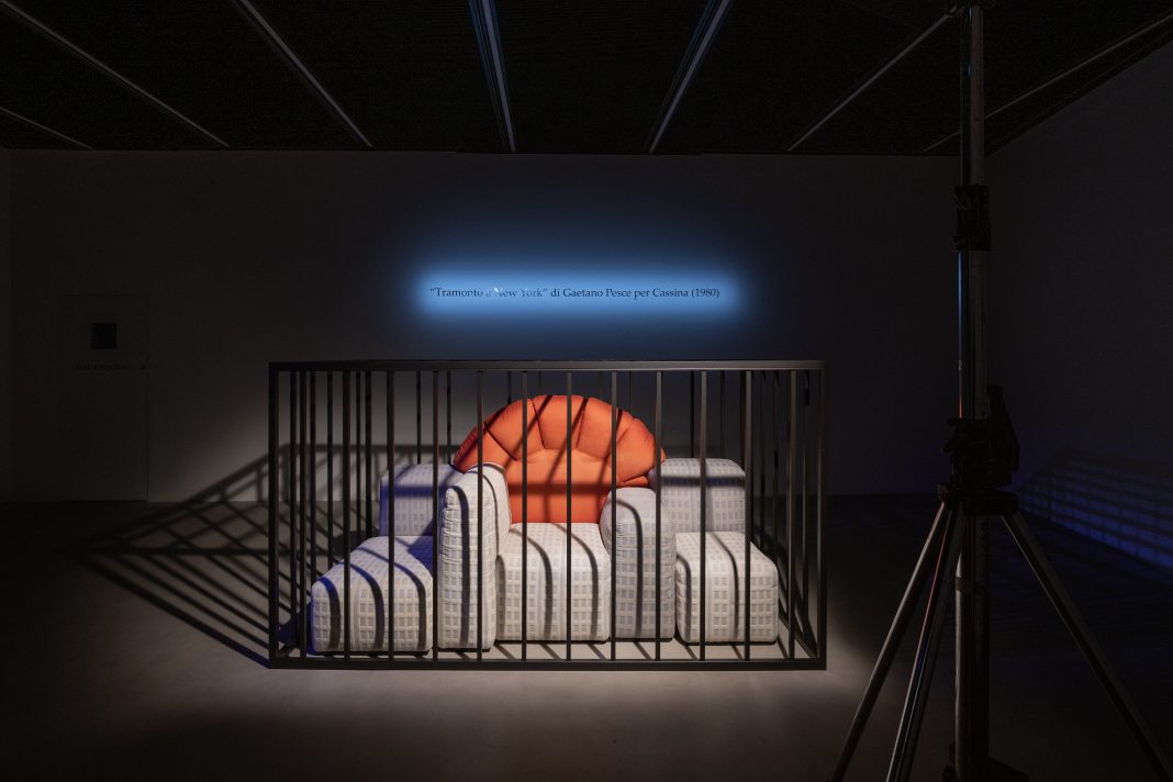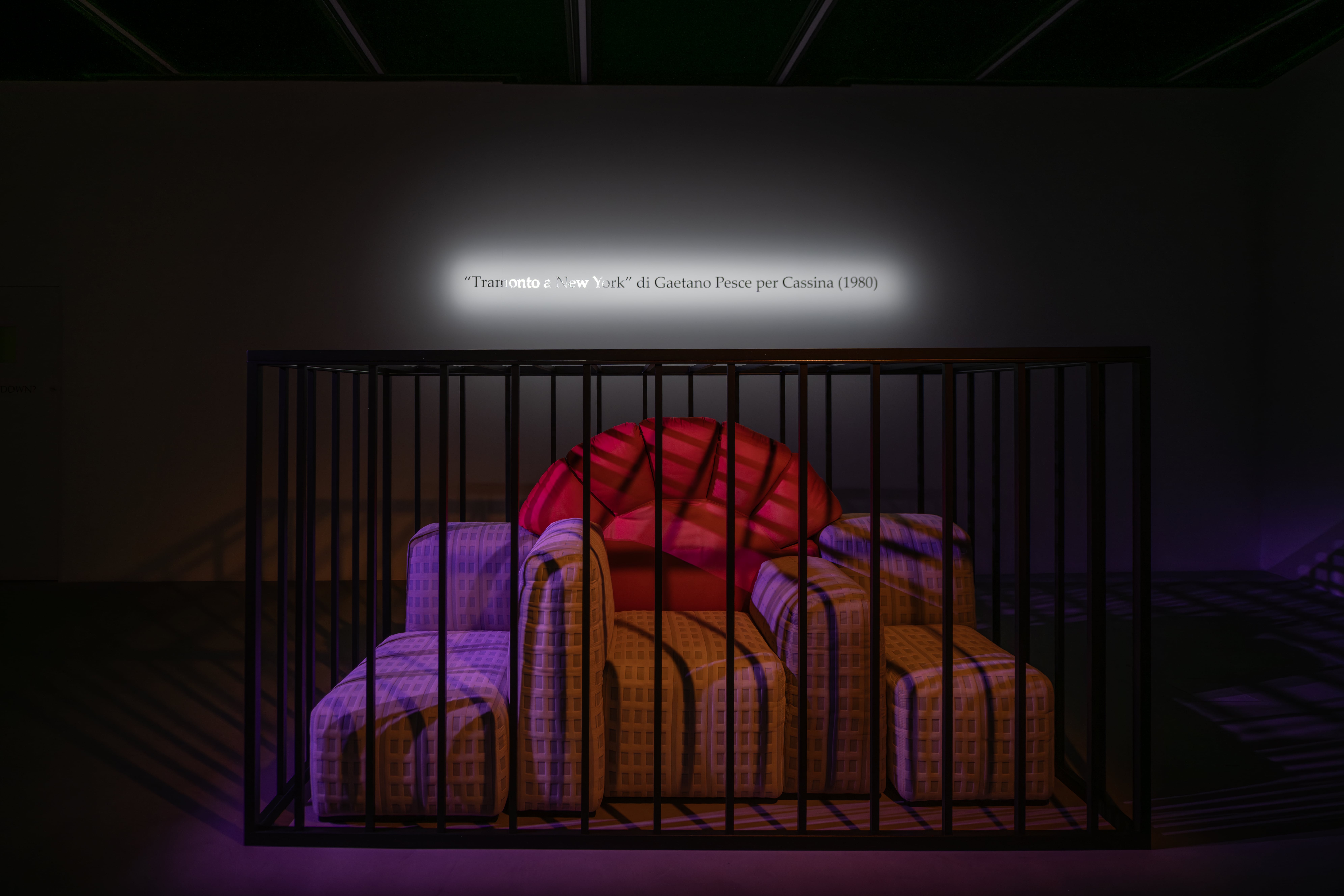 Una delle icone che hanno ispirato Raffele Curi è Tramonto a New York (1984) di Gaetano Pesce, celebre divano progettato negli anni ‘80, in risposta a un presentimento di decadenza della città da parte dell’artista e designer. L’opera è esposta al primo piano, imprigionata da una gabbia che impedisce di sedervisi, a sottolineare un sentimento di chiusura, di fine.