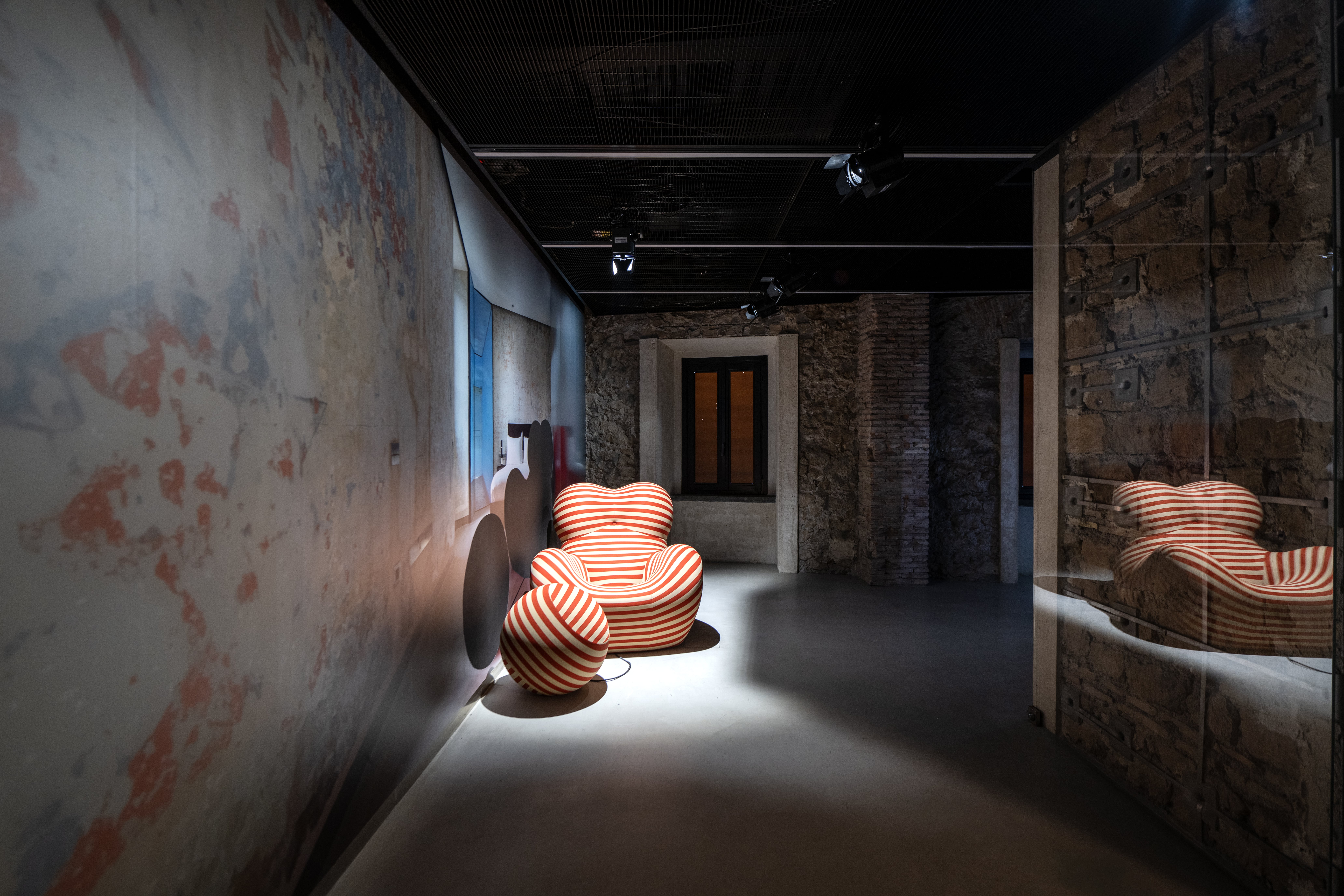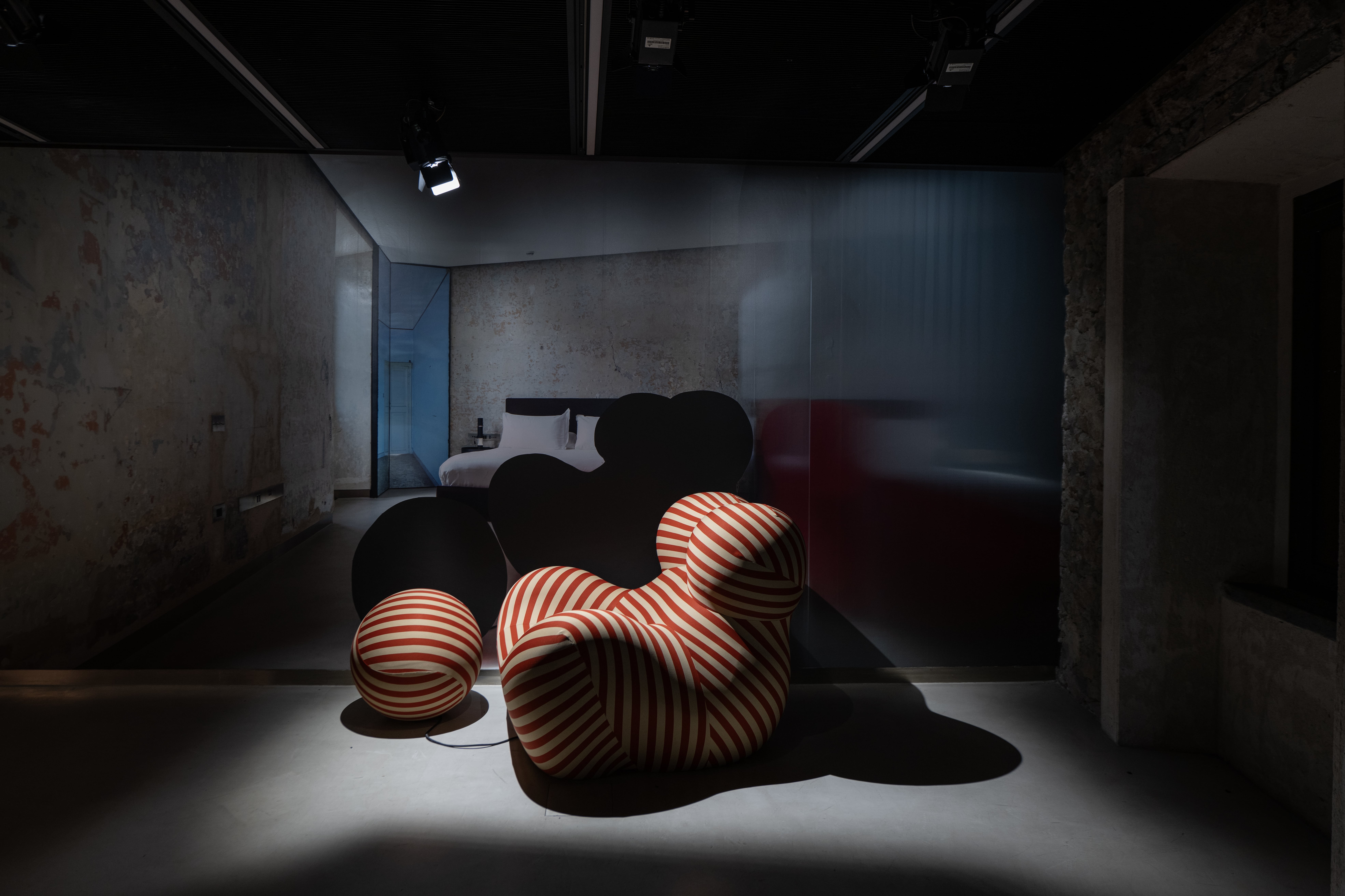 Il caleidoscopico susseguirsi di citazioni prosegue ai piani superiori. Sempre di Gaetano Pesce, troviamo la poltrona UP5, insieme al suo poggiapiedi UP6, iconica combinazione di sedute progettate dal designer nel 1969, qui messe in dialogo con una gigantografia dell’appartamento 26 del palazzo, dove l’archistar Jean Nouvel ha posizionato un’altra versione della stessa. Le forme morbide e avvolgenti dell’opera si ispirano alle veneri paleolitiche, a simboleggiare fertilità, ma ancor più pressante è la critica rivolta alle difficoltà che pertengono alla condizione femminile, tema più che mai calzante nel clima politico attuale.