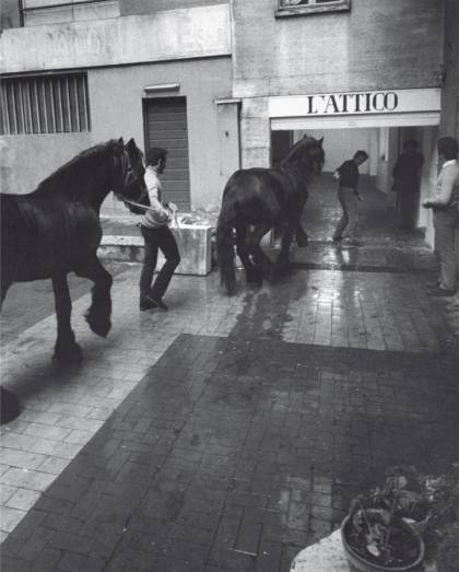 Fabio Sargentini e i cavalli di Jannis Kounellis che entrano a L’Attico di via Beccaria, 1969