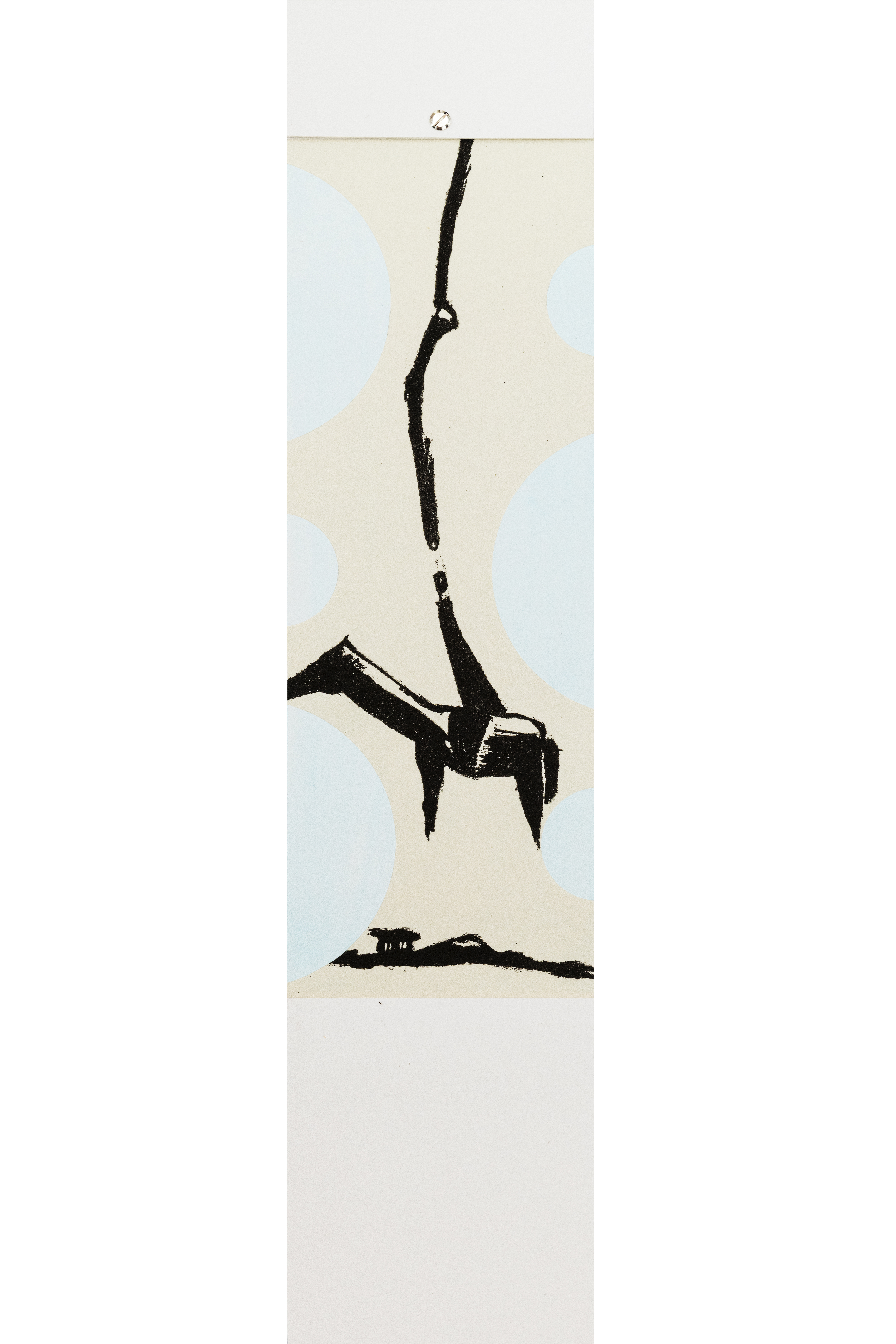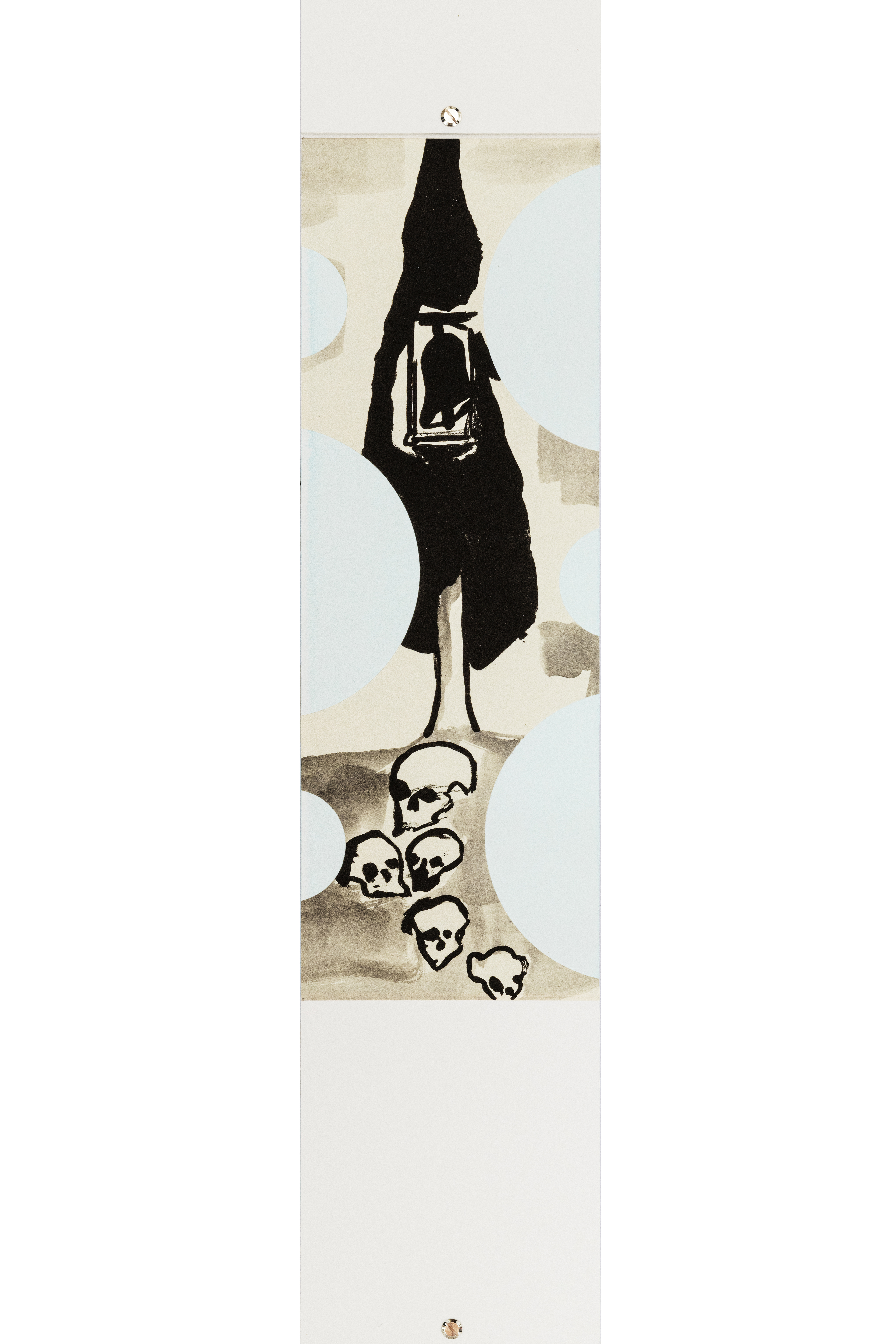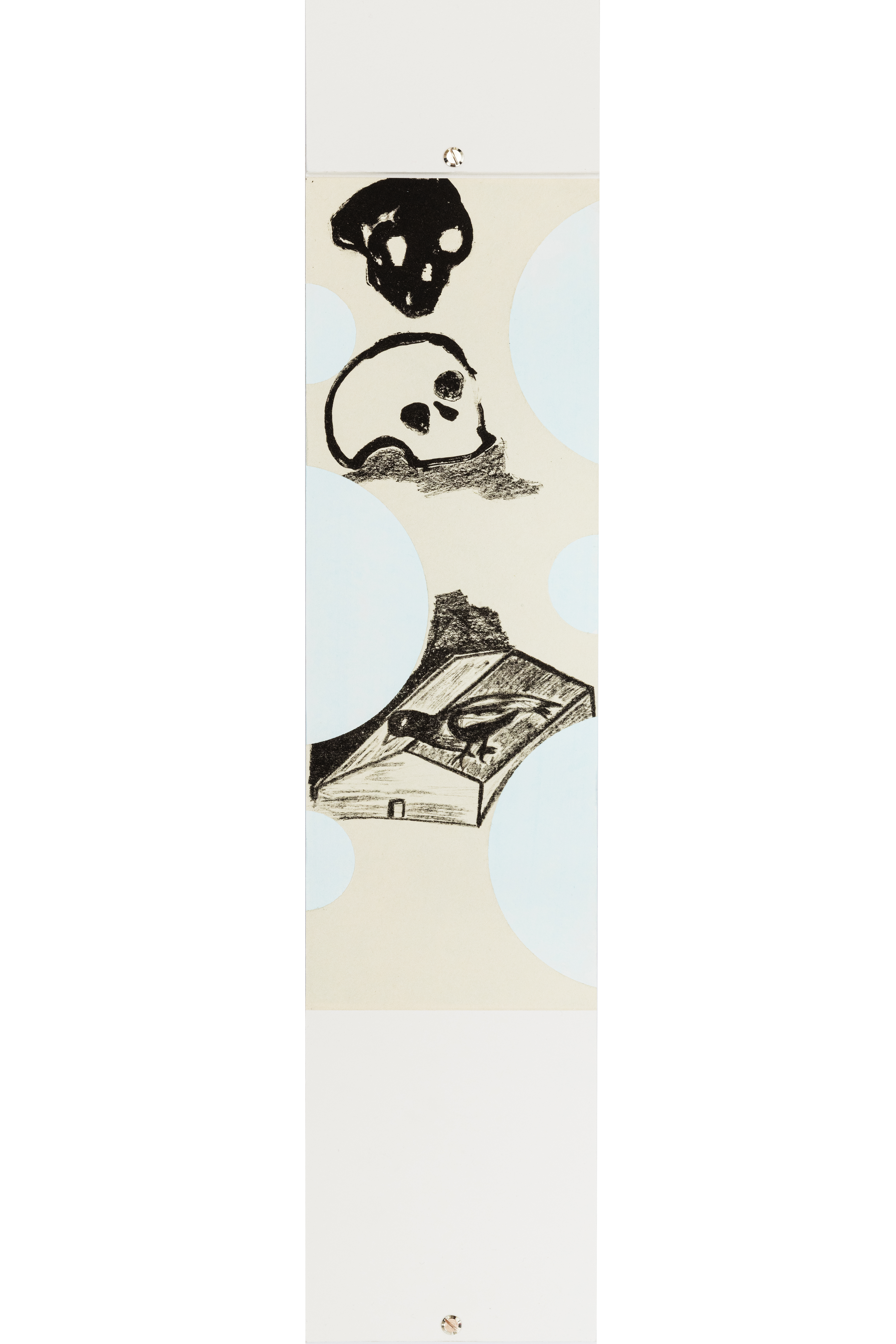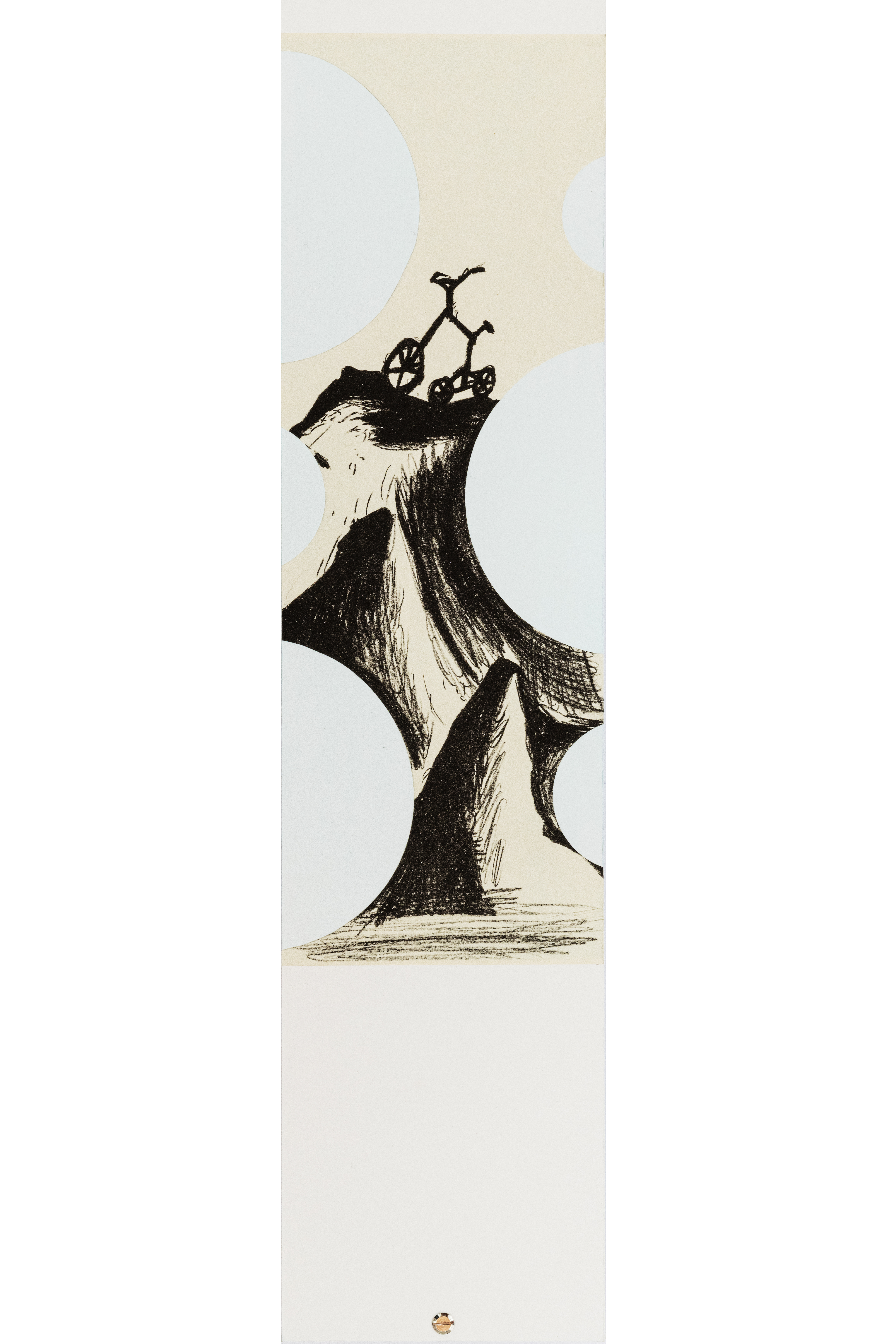 Le immagini abbozzate dall’artista si confanno al suo linguaggio corsivo e sono tutte in bianco e nero, i soggetti scelti – una bicicletta, dei teschi che emergono tra case e terra, un campanile – sono tutti connessi come in un unico flusso visivo che termina con un cavallo la cui sella è legata a un nastro.
