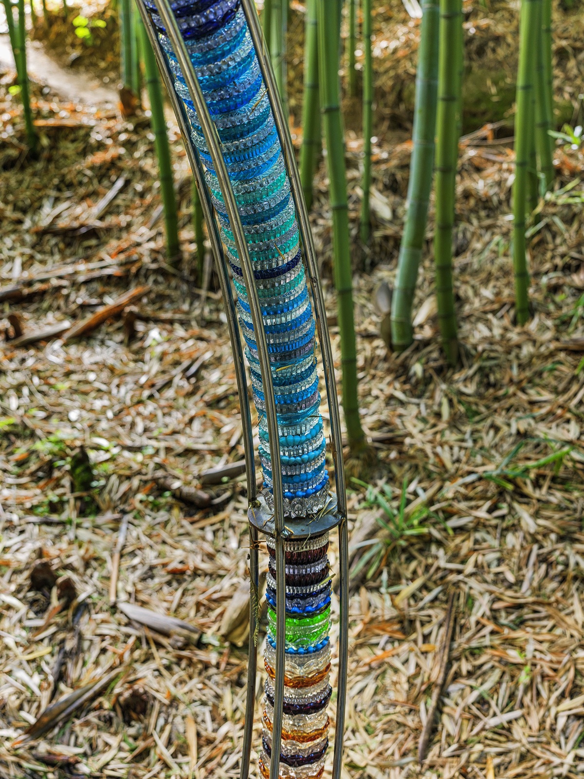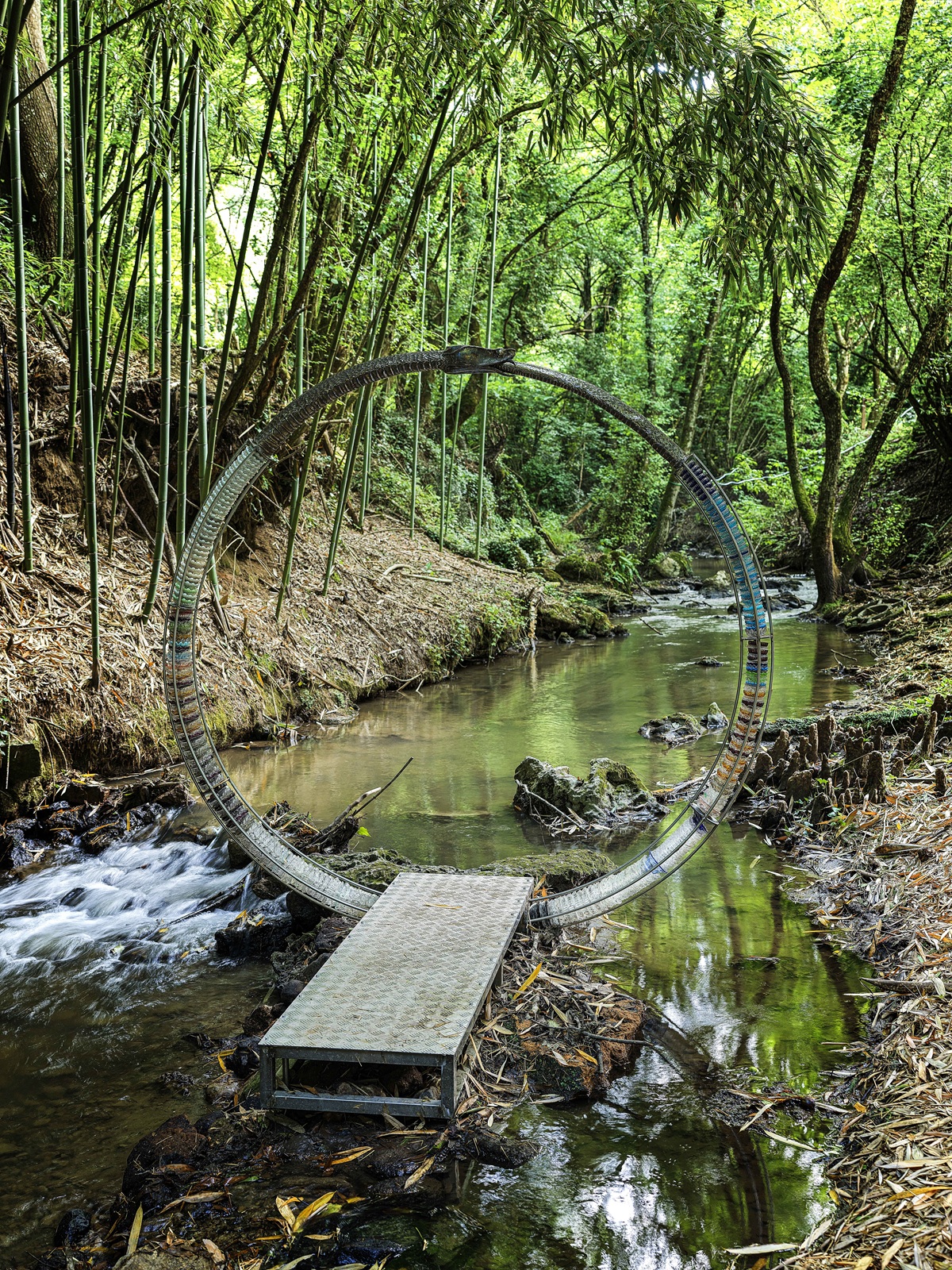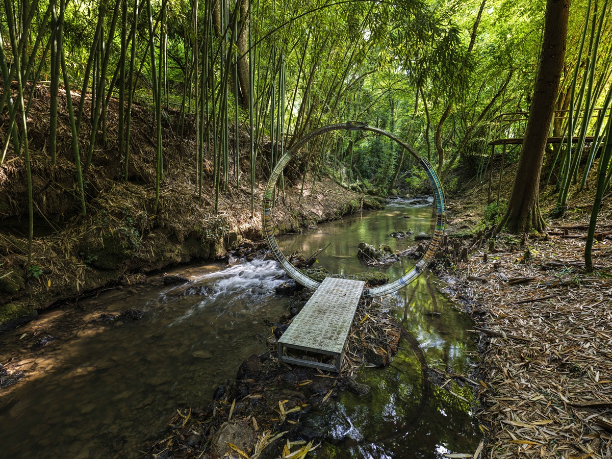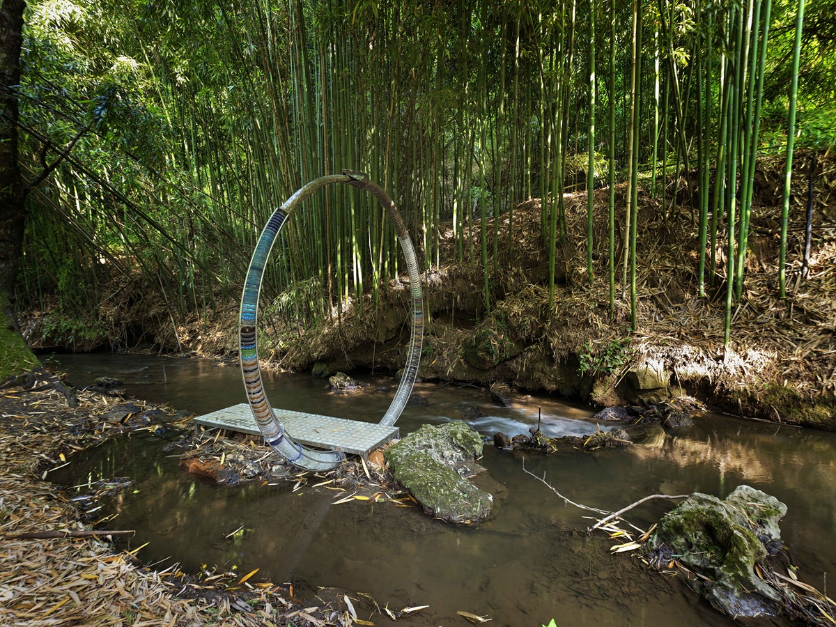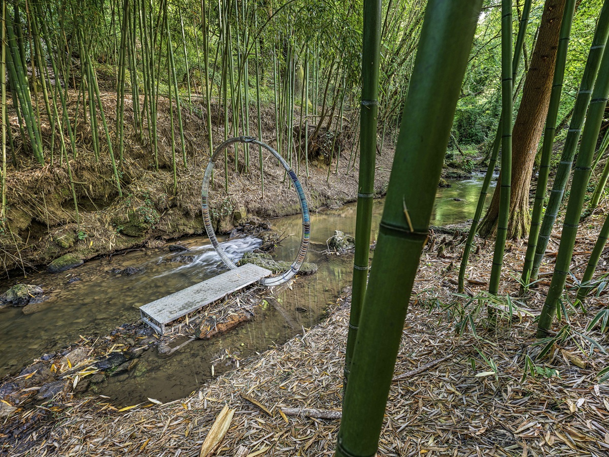 «La durezza dei materiali utilizzati si scontra, in un gioco di contrapposizioni cangiante e attraente, non solo con il significato nascosto dell’opera ma anche con la delicatezza della fruizione per cui è stata realizzata. Infatti, la scultura è pensata come una soglia da attraversare per giungere a una postazione di meditazione su una pietra piatta, emergente dal fiume Rio Chiaro, raggiungibile attraverso una passerella in alluminio che parte dalla riva, tra i bambù. Così arte e natura s’insinuano l’una nell’altra, aiutate anche dall’elemento acquatico del fiume e da quello luminoso dei raggi di sole che filtrano tra le piante.