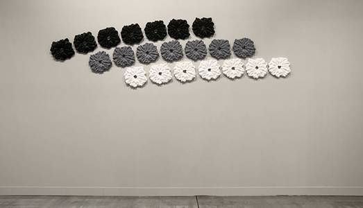 Rompere il concetto di quadro, appunto, con frammenti che si appropriano del muro con opere concepite come timbri musicali che sembrano muovere lo spazio, scanditi dal brano musicale di Johann Sebastian Bach, Preludio in Do maggiore PWV 846, compositore amato, scelto da Pinelli per accompagnare la fruizione emotiva della sua opera. Tutto il suo fare, parte dall’idea di comporre uno spartito musicale, da accordi tra astrazione e decorazione, luce, colori e ombre, vuoti e pieni, una metaforica melodia espressa per assonanze cromatiche, scale timbriche con variazioni melodiche, contrappunti tonali per dare vita a cinque movimenti musicali: il ritmo grave, l’andante e il mosso, fino al brio dell’adagio, che evoca il movimento del mare.